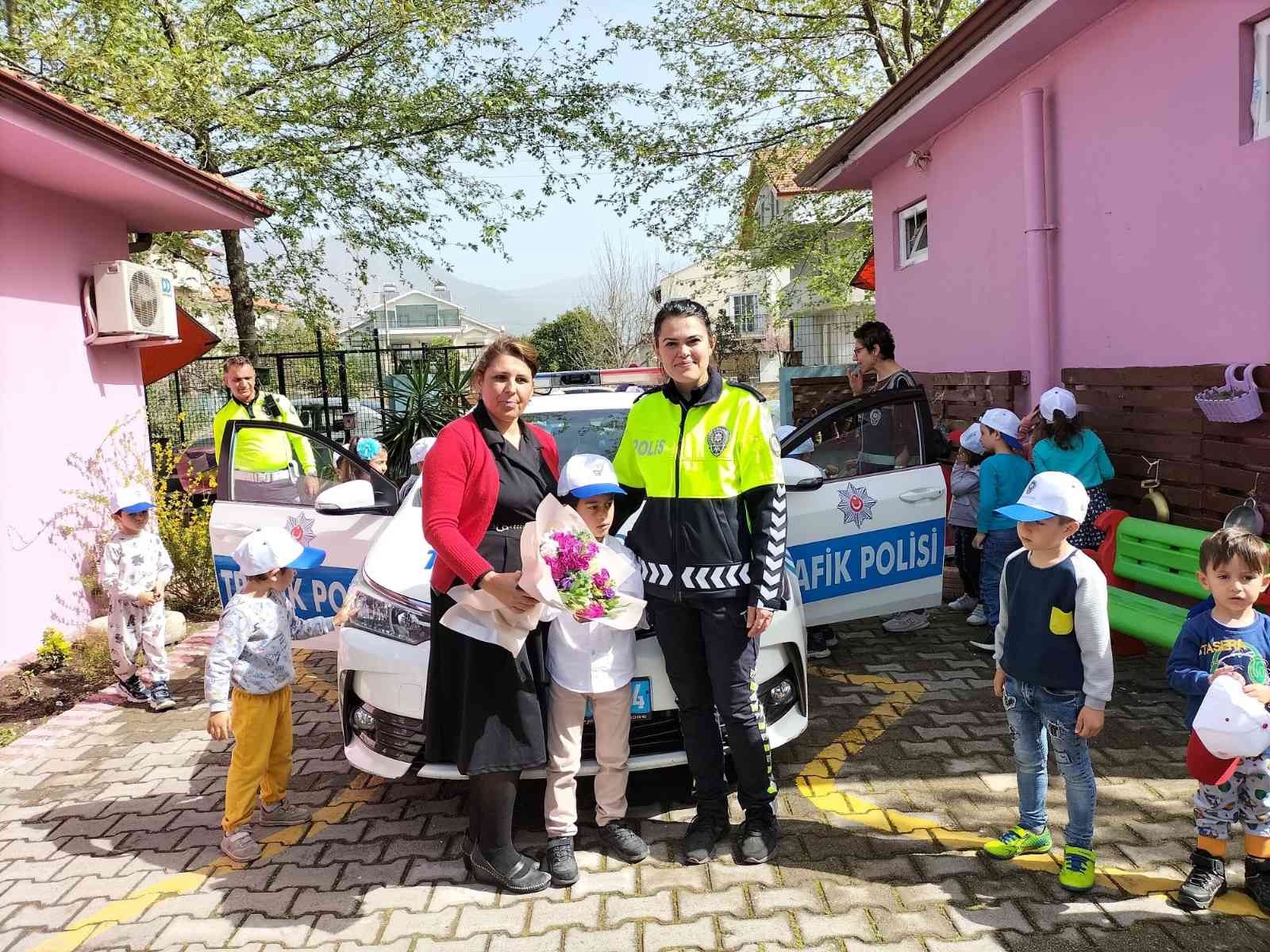 Köyceğiz İlçe Emniyet Müdürlüğü ekipleri, Polis Haftası çerçevesinde Köyceğiz Anaokulu öğrencilerini ziyaret etti. Etkinlikte, polisler tarafından Anaokulu Müdürü Şengül Yaşar’a çiçek takdim edildi. Teşekkür eden Yaşar, Polis Haftası’nı kutladı. Miniklerle bir araya gelen polisler şapka hediye ederek minik öğrencileri sevindirdi. Şapkasını giyen öğrencilerin mutlu olduğu görülürken, öğrenciler hediye getiren polislere teşekkür ederek, Polis Haftası’nı hep bir ağızdan kutladı. Okul bahçesindeki polis aracı meraklı öğrencilerin hücumuna uğradı. Öğrenciler aracın klaksonunu çalmanın heyecanını yaşarken, ziyaret sonunda polis ekipleri öğrencilerle hatıra fotoğrafı çektirdi.