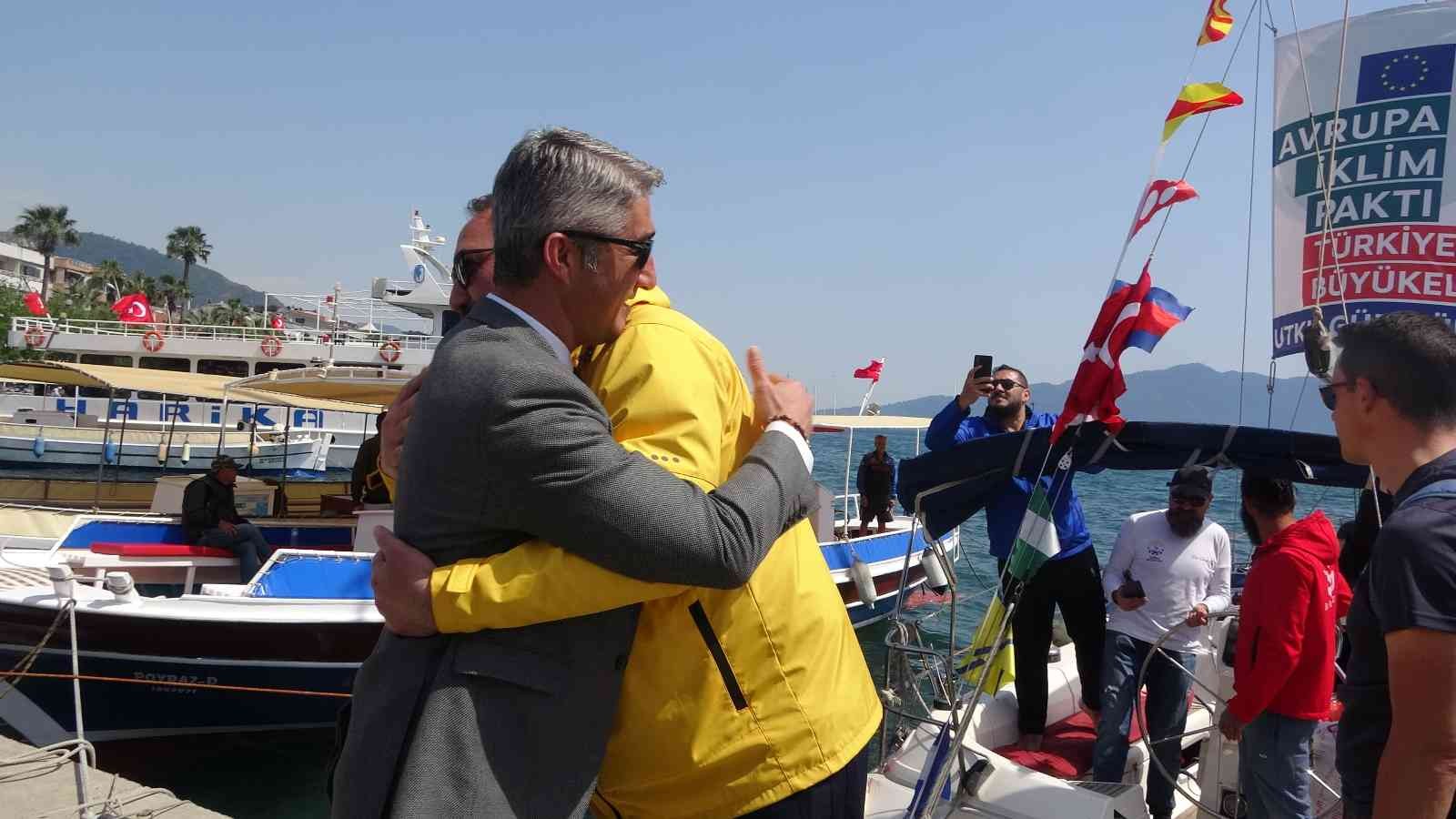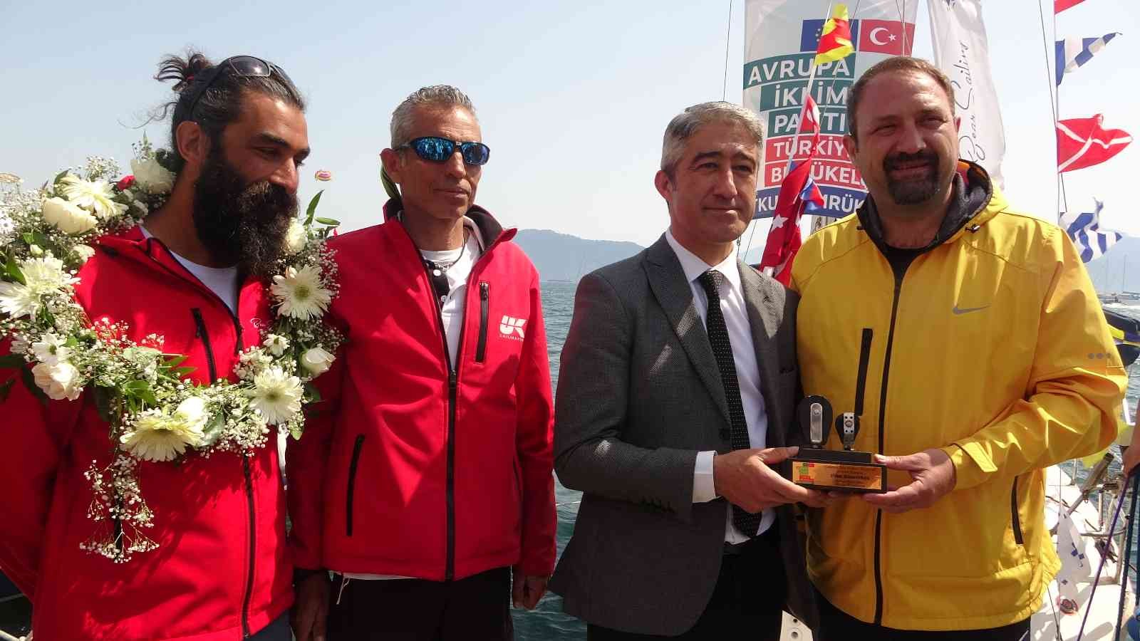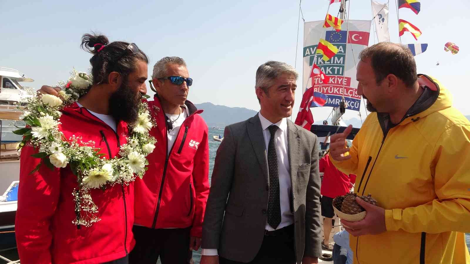 Yelkenciler ile birlikte tekneden inen Çiğli Belediye Başkanı ve Avrupa Komisyonu tarafından Avrupa İklim Paktı Türkiye Büyükelçisi seçilen Utku Gümrükçü yanlarında getirdiği Kozalaklar haricinde denizde yelkenlinin kırılan makaralarından yapılan bir hatıra plaketini Marmaris Belediye Başkanı Mehmet Oktay’a hediye ettiler.