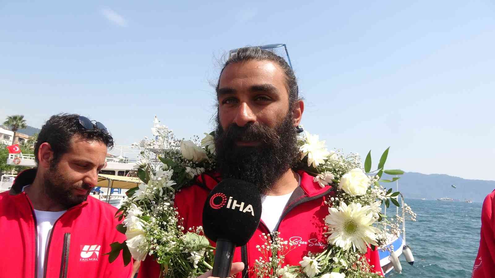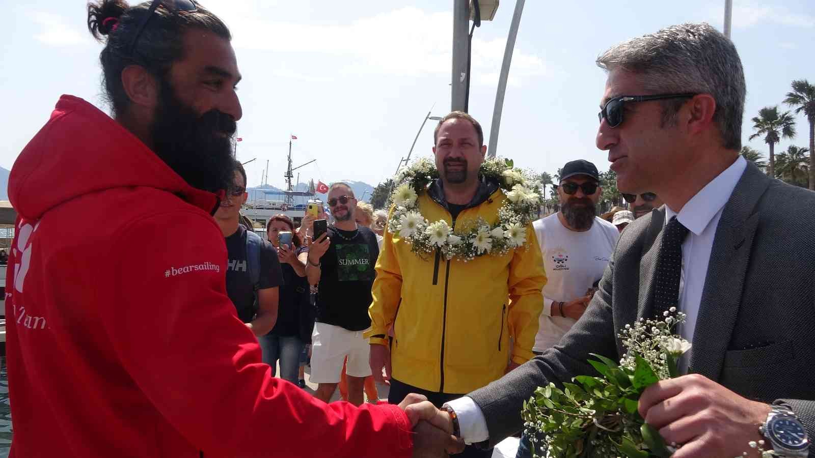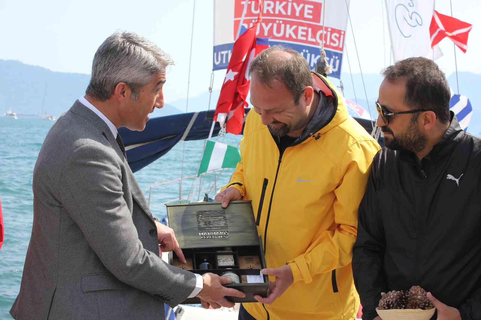 Yelkenciler ile birlikte tekneden inen Çiğli Belediye Başkanı ve Avrupa Komisyonu tarafından Avrupa İklim Paktı Türkiye Büyükelçisi seçilen Utku Gümrükçü yanlarında getirdiği Kozalaklar haricinde denizde yelkenlinin kırılan makaralarından yapılan bir hatıra plaketini Marmaris Belediye Başkanı Mehmet Oktay’a hediye ettiler.