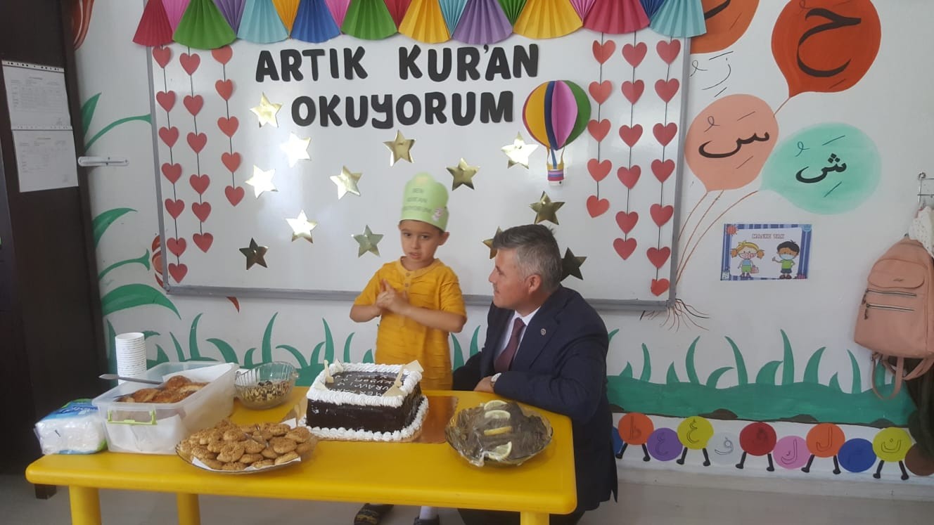 İlçe Müftüsü Ahmet Karagöz; “Kuran Kursumuzda 4-6 yaş grubu sabah ve öğlenden sonra olmak üzere iki sınıf halinde eğitime devam etmektedir. Daha önce öğleden sonraki kursa devam eden çocuklarımız için tören yapılmıştı. Bu gün de sabahtan kursumuza gelen çocuklarımızın heyecan ve sevincine ortak olmak için geldik. Müftülüğümüze bağlı diğer Kuran Kurslarımızda da büyüklere yönelik kurslarımız devam ediyor. Ayrıca Cumartesi ve Pazar günleri de çalışanlara, memurlara yönelik kurslarımız sürüyor. Müftülük olarak 4-6 yaş eğitim öğretimini çok önemsiyoruz. Küçük yaşta çocuklarımız hem eğleniyorlar ve hem de eğlenerek değerlerimizi, Kuran-ı Kerimi, örf ve adetlerimizi öğreniyorlar. Yavrularımızın hayatları boyunca dinine, vatanına ve milletine hizmet eden, faydalı birer insan olarak yetişmelerini Yüce Mevla’dan temenni ve niyaz ediyorum. Siz değerli ailelerimizi ve 4-6 yaş Kuran Kursu öğreticisi Feride Hoca Hanımı ve tüm Kuran Kursu hocalarımı kutluyorum” dedi. Müftü Karagöz, konuşmasından sonra Kur’an okumaya başlayan öğrencimizle birlikte günün anısına hazırlanan pastayı kesti. Öğrencilere yapılan ikramlar, çeşitli hediyelerin verilmesi ve akabinde hatıra fotoğrafı çekimi ile program sona erdi.
