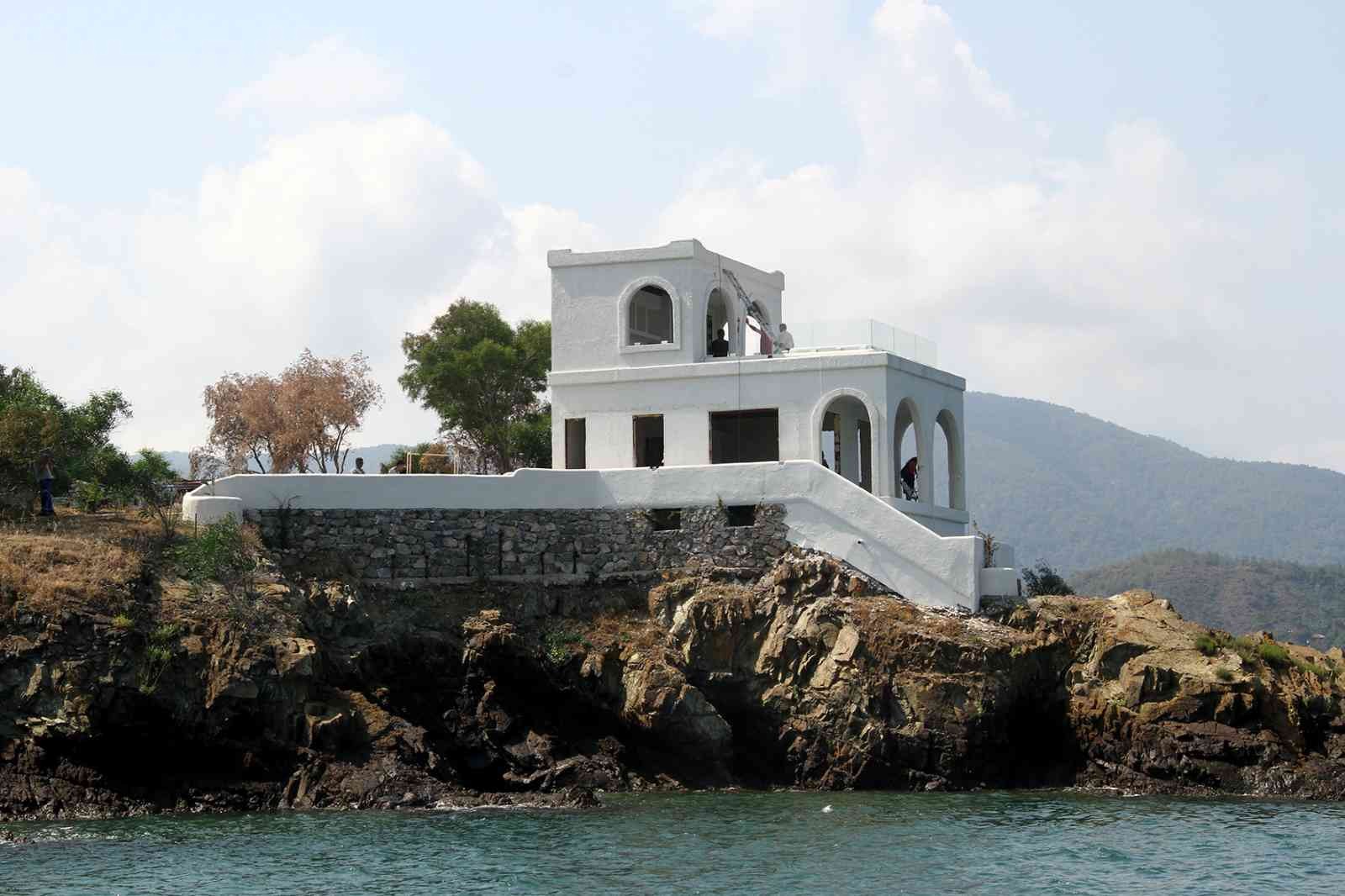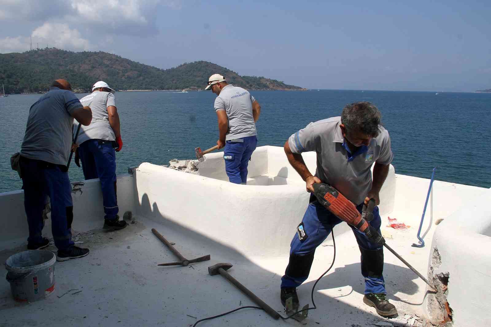 Muğla’nın Fethiye ilçesi Şövalye Adası’na tekneyle ulaşım sağlayan belediye ekipleri imara aykırı olduğu belirlenen binanın yıkımına başladı.