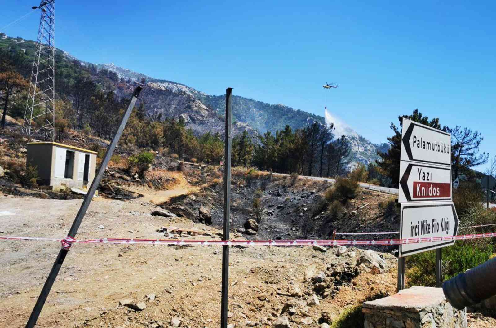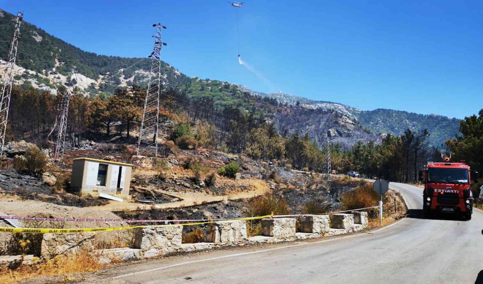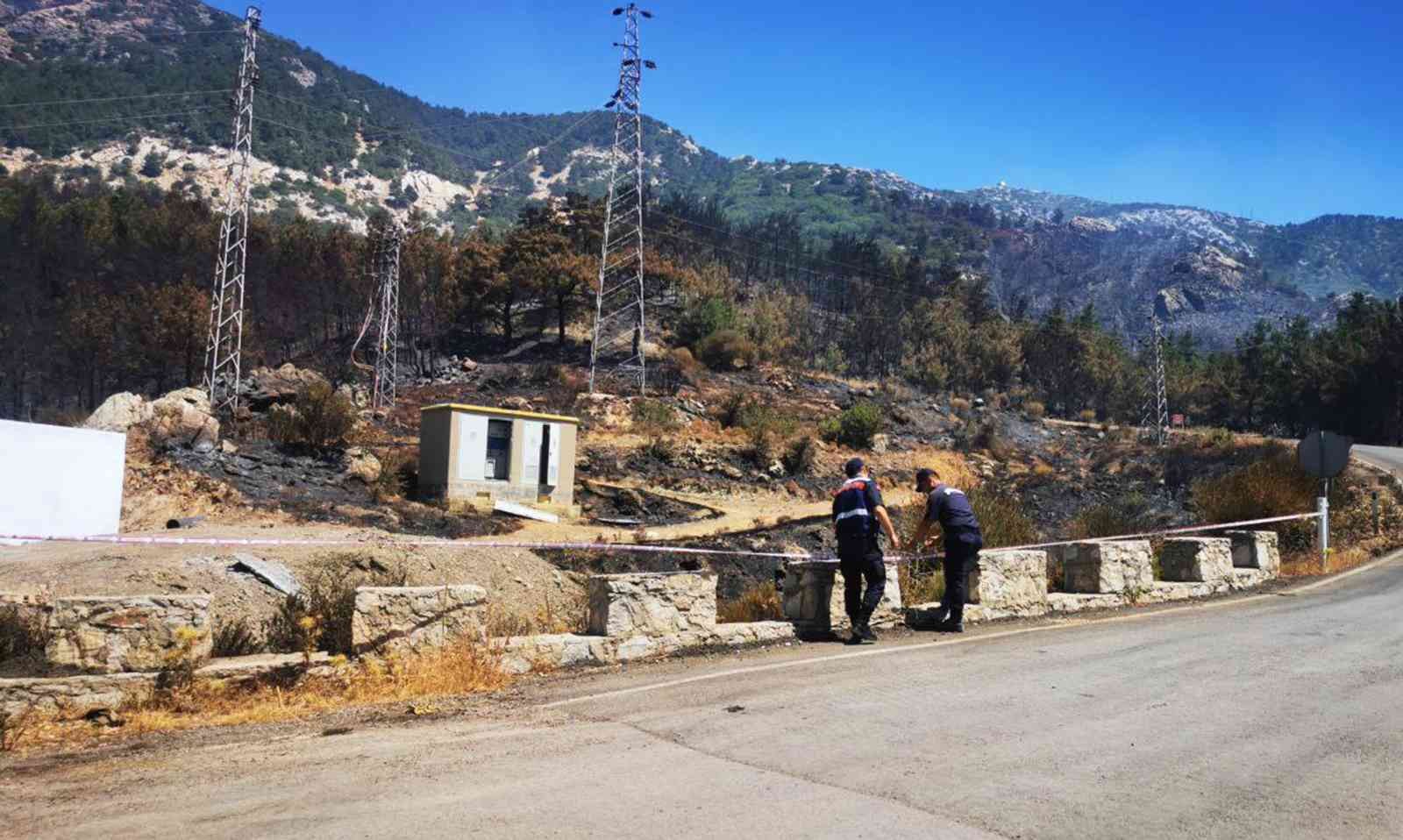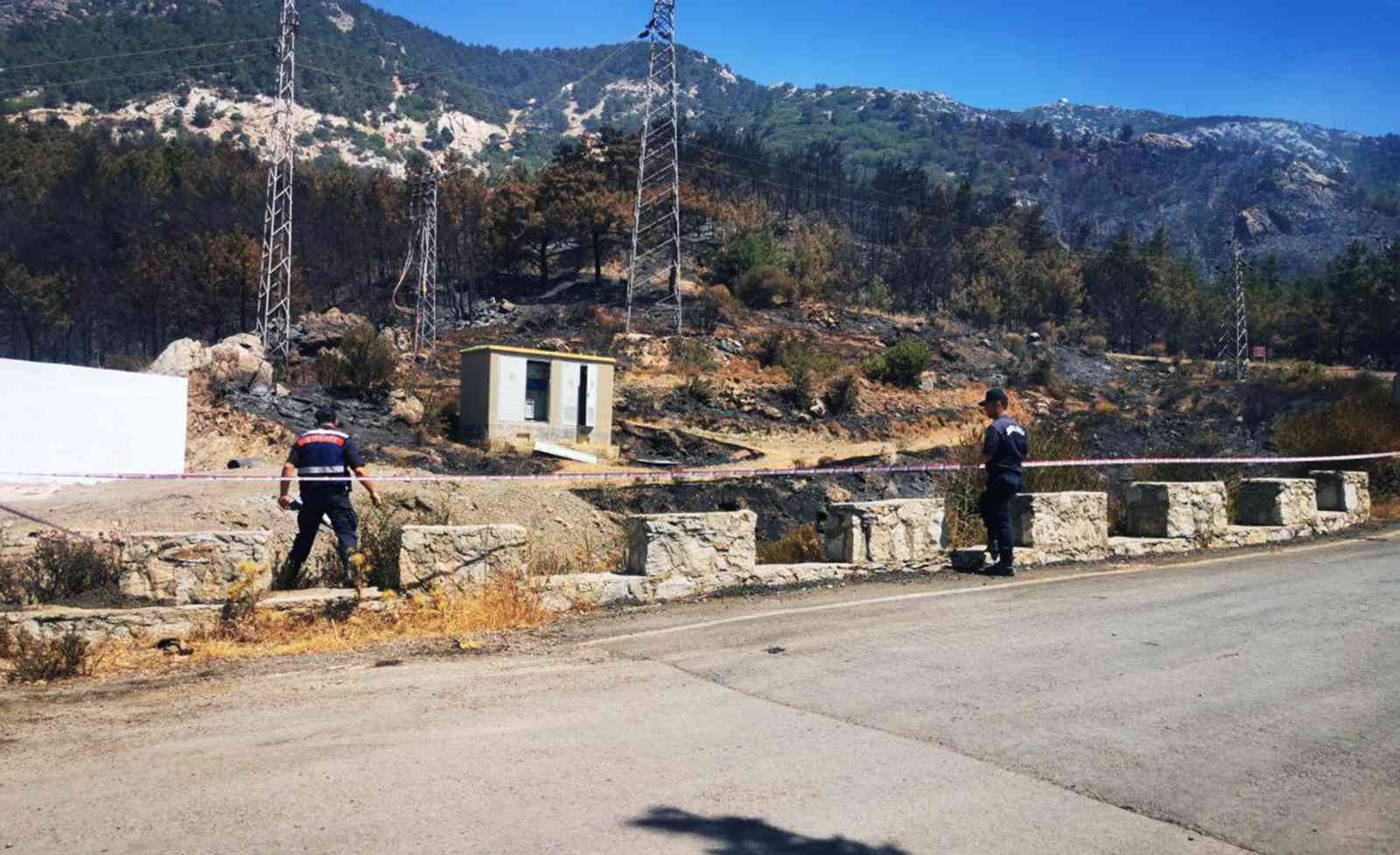 Muğla’nın Datça ilçesine bağlı Mesudiye Mahallesi’nde 13 Temmuz’da 300 hektarı ormanlık, 400 hektarı da tarım arazisi olan toplam 700 hektar alanın zarar gördüğü yangının çıkış noktası olarak değerlendirilen trafo çevresinde jandarma ekipleri inceleme yaptı.