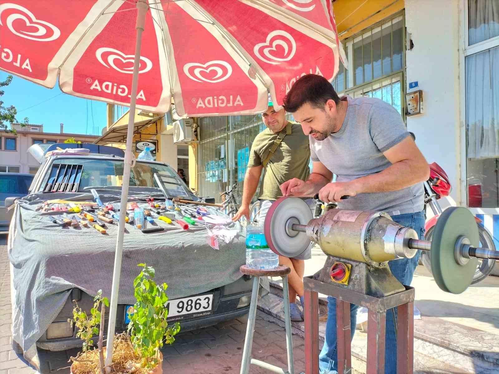 Muğla’nın Köyceğiz ilçesinde bıçak bileme ustaları Kurban Bayramı öncesi fazla mesai yapıyor.