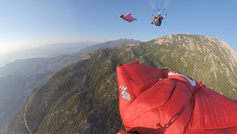 Muğla’nın Fethiye ilçesinde wingsuit sporcusu Cengiz Koçak ile Ferdi Toy’un bir paraşütün yanından yan yana yaklaşık 200 kilometre hızla geçme anları izleyenlerin nefeslerini kesti.
