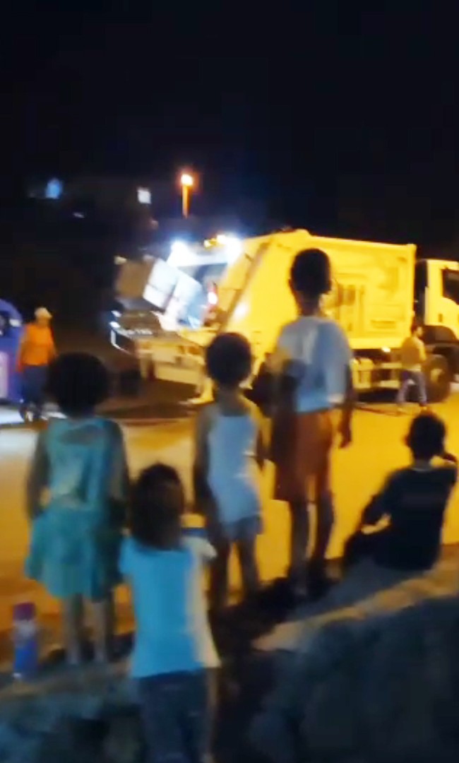 Çocukların büyük heyecanla çöp kamyonundaki görevlilerden çikolata gelmesini bekledikleri anlar mahalle sakinleri tarafından cep telefonları ile görüntülenirken, görüntüler izleyenleri tebessüm ettiriyor.