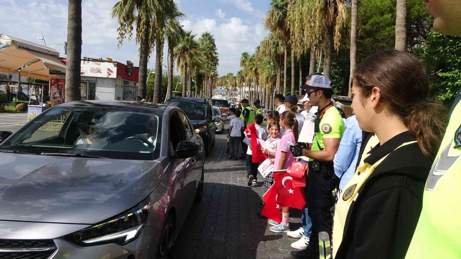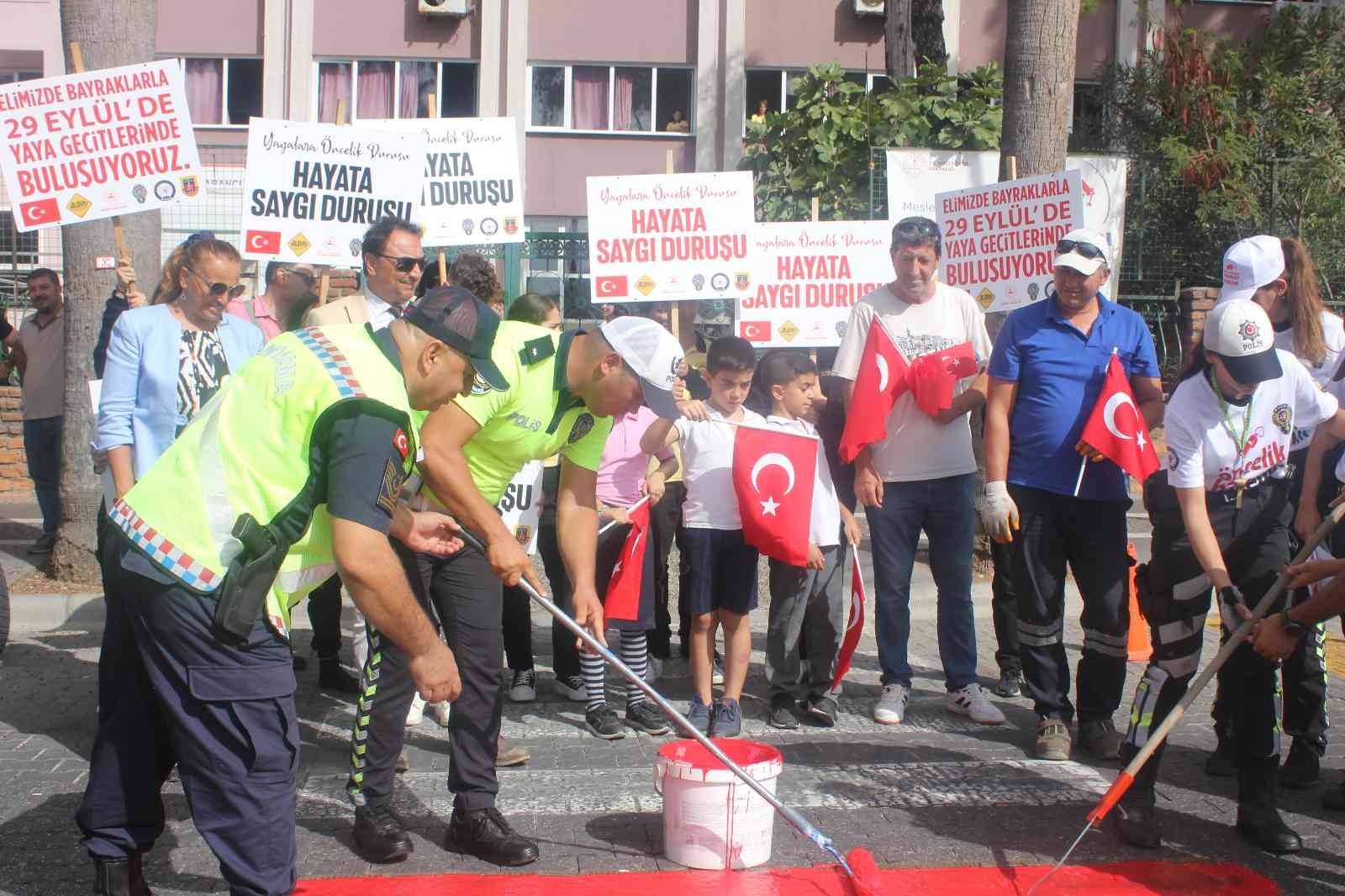 Tüm yurtta olduğu gibi Muğla’nın Marmaris ilçesinde de yaya önceliğinde farkındalık oluşturmak üzere öğrenciler ve ilçe emniyet müdürü, jandarma komutanı ve milli eğitim müdürlüğü ile ellerinde pankartlar ile farkındalık oluşturarak yaya geçitlerindeki şeritleri kırmızıya boyadılar.