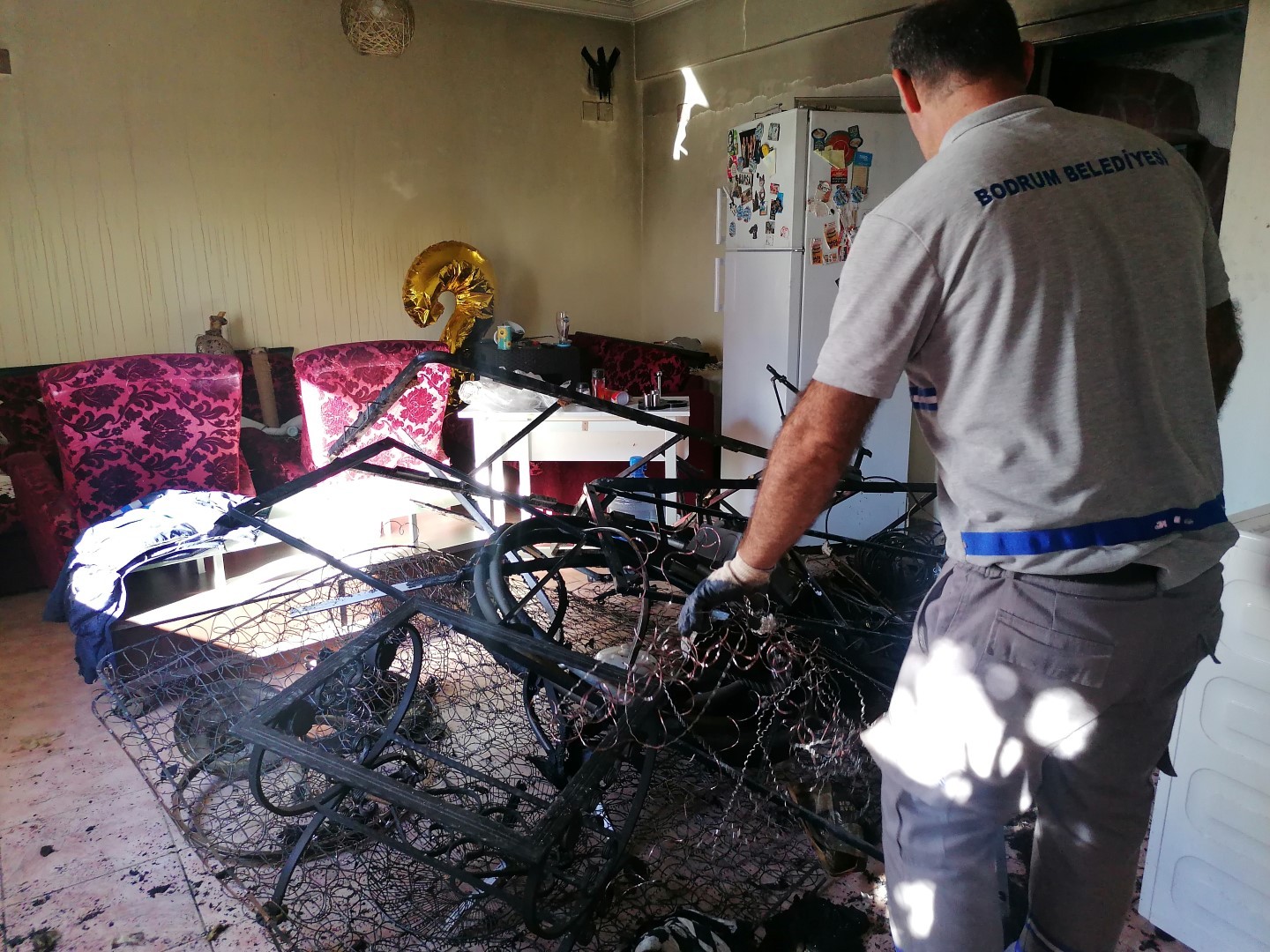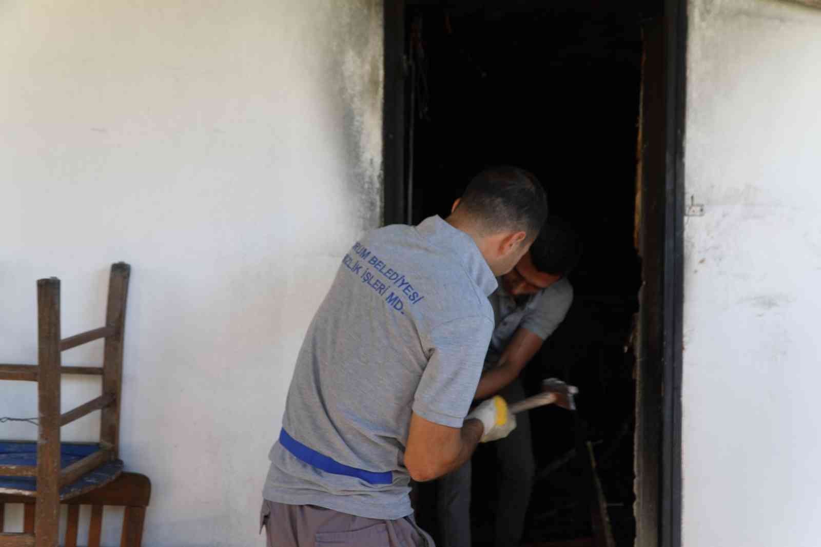 Geçtiğimiz hafta sonu Kumbahçe Mahallesi İçmeler Mevkii’nde meydana gelen yangında zarar gören ev ve aile için Bodrum Belediyesi Temizlik İşleri, Fen İşleri, Destek Hizmetleri, Kültür ve Sosyal İşler ile Basın Yayın ve Halkla ilişkiler Müdürlüğü ekipleri koordineli olarak çalıştı. Öncelikle, Belediye Kültür ve Sosyal İşler Müdürlüğü ekipleri, hasar gören evin toparlanması sürecinde aile fertlerini Bodrum’da bir pansiyona yerleştirdi.