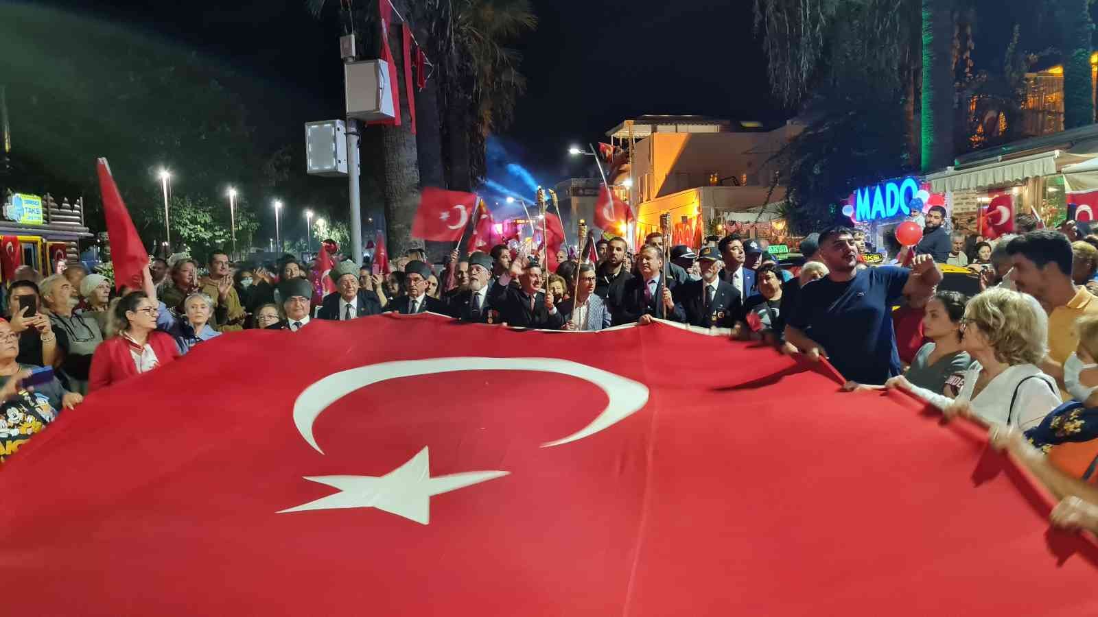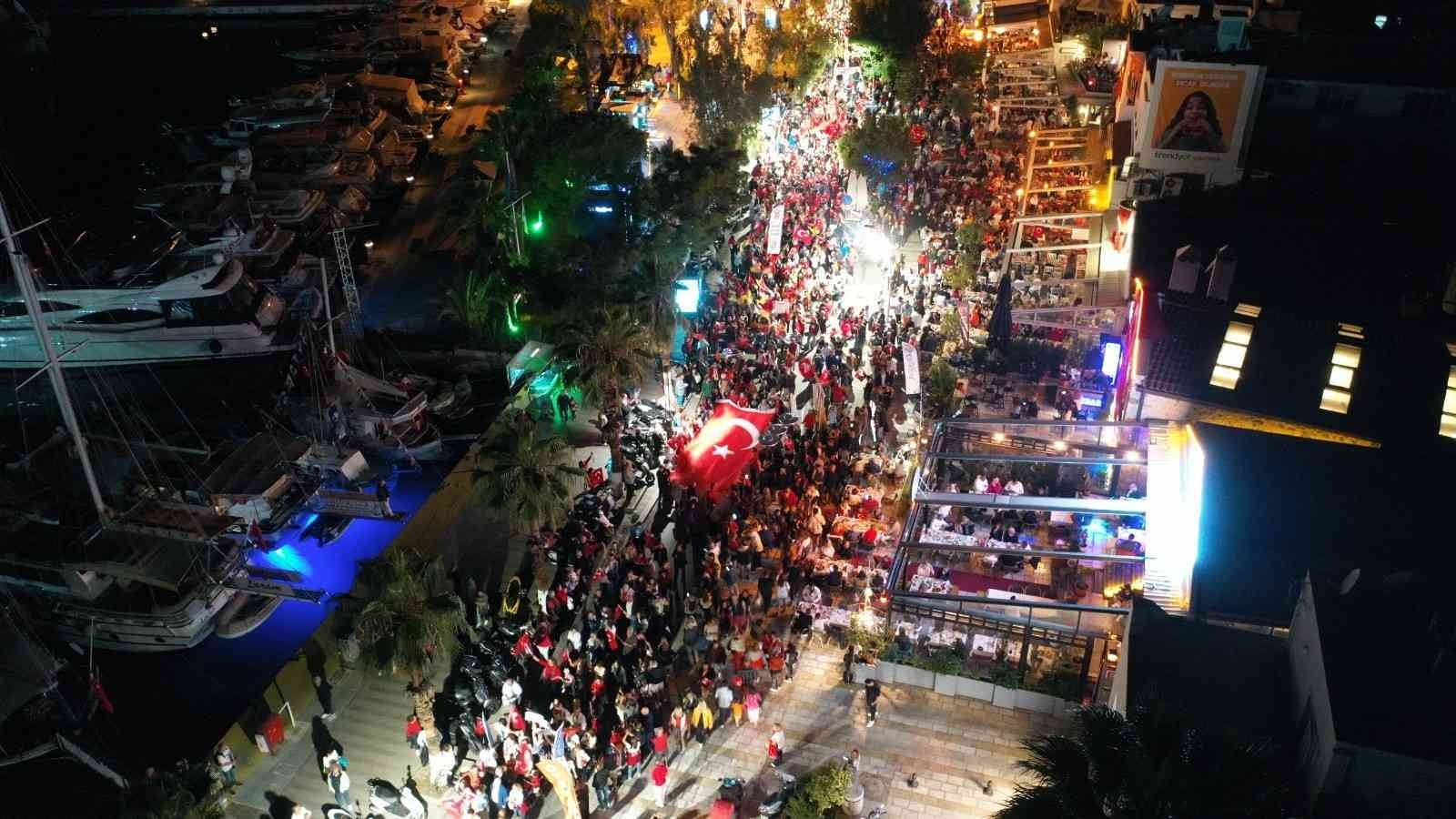 Muğla’nın Bodrum ilçesinde 29 Ekim Cumhuriyet Bayramı’nın 99’uncu yılında her yaştan yaklaşık 10 bin kişi fener alayına katıldı. Fener alayı, kilometrelerce uzadı.