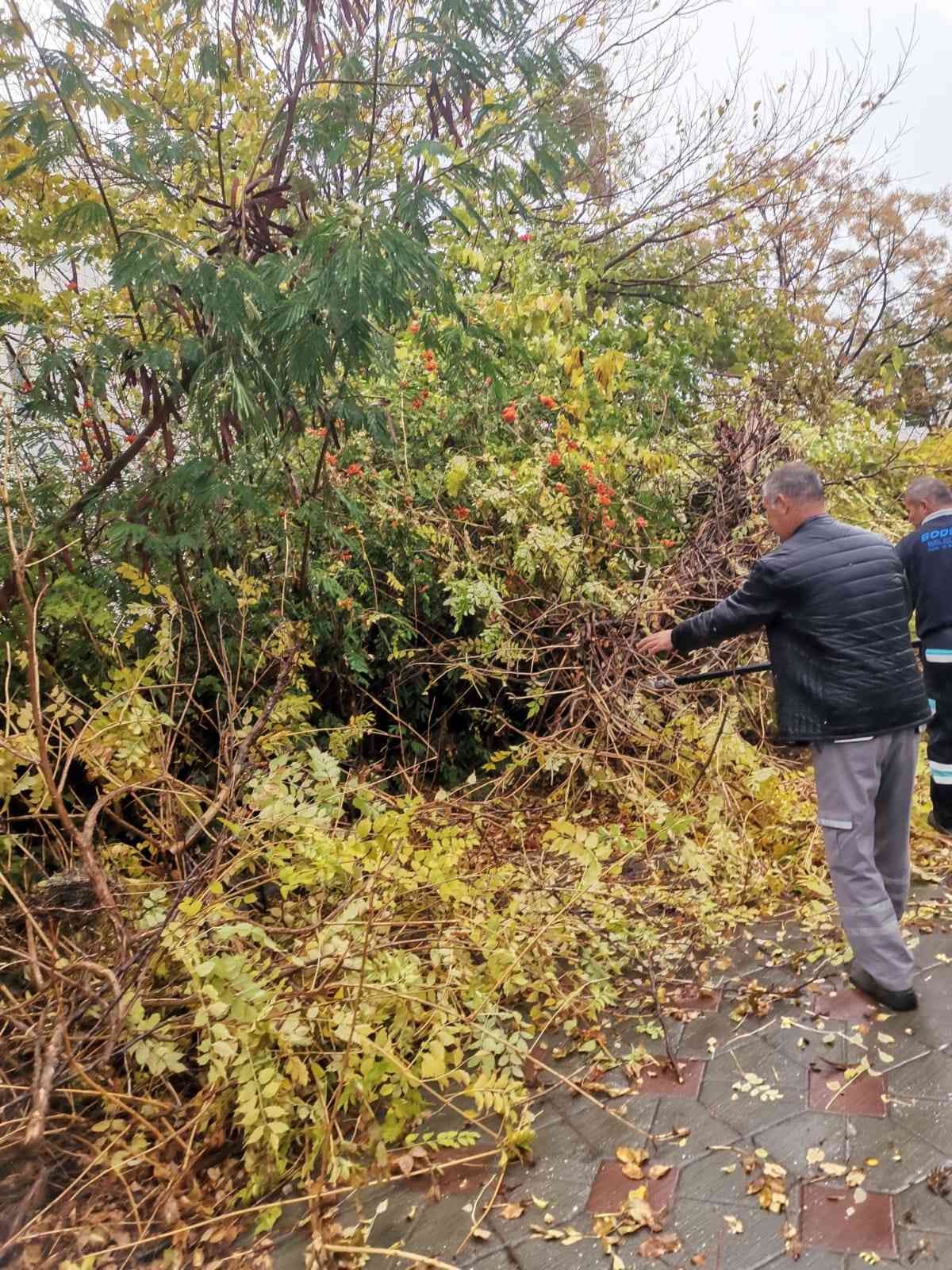 Meteorolojinin Bodrum için uyarısının ardından ilçede sabah saatlerinde aralıklı yağmur başladı. Öğlen saatlerinde bir anda bardaktan boşalırcasına yağan yağmurun fırtınayla birleşmesiyle birlikte okullar tatil edildi. Bodrum Kaymakamlığı’nın koordinesinde AFAD, AKUT, emniyet güçleri ve Bodrum Belediyesi ekipleri tüm personellerini sel ve su baskınlarına karşı alarma geçti. Ağaçların devrildiği ilçede sokaklar ve caddeler göle dönerken, hayat durma noktasına geldi. Yıkılan ağaçlara Bodrum Belediyesi Park ve Bahçeler Müdürlüğü ekipleri müdahale etti. Ekipler, dere yataklarında suyun geçişini engelleyecek ağaç ve dalları da kaldırdı.