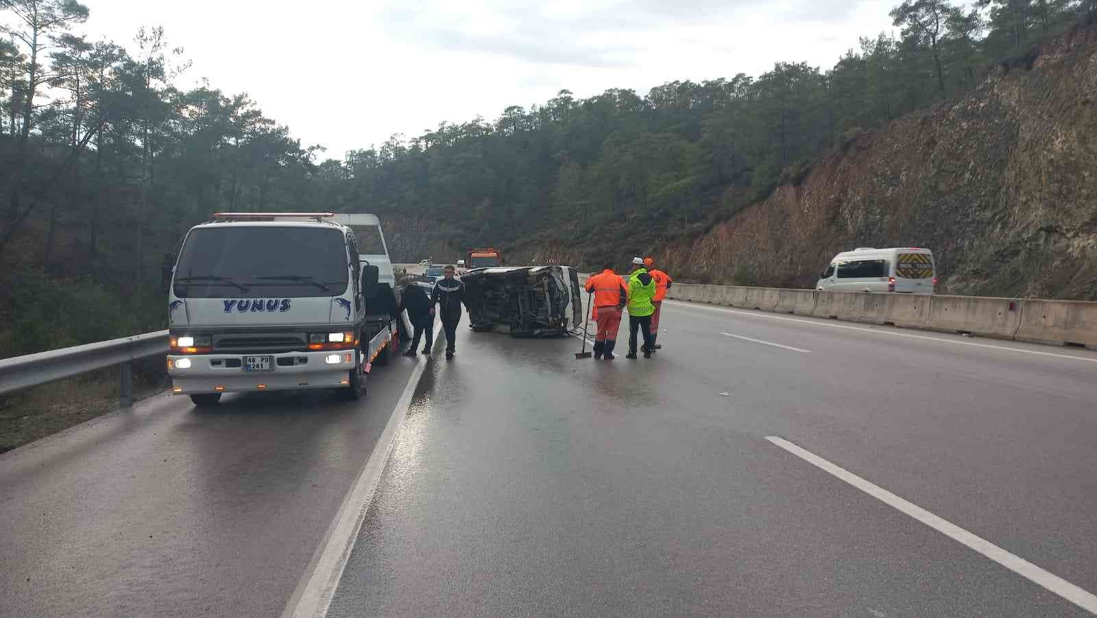 Edinilen bilgiye göre, Ali K.’nın kullandığı 48 GB 090 plakalı minibüs, Fethiye Antalya karayolu İnlice Mevkiinde yağışlı hava nedeniyle kayganlaşan yolda sürücüsünün direksiyon hakimiyetini kaybetmesi üzerine devrildi. Kazada sürücü ile Reşit G., Abdulmecit K. ve Filiz E. yaralandı. Kazayı görenlerin 112 Acil Çağrı Merkezi’nden yardım çağrısı üzerine olay yerine sağlık ve polis ekipleri sevk edildi. Yaralılar ilçedeki hastanelere kaldırıldı.