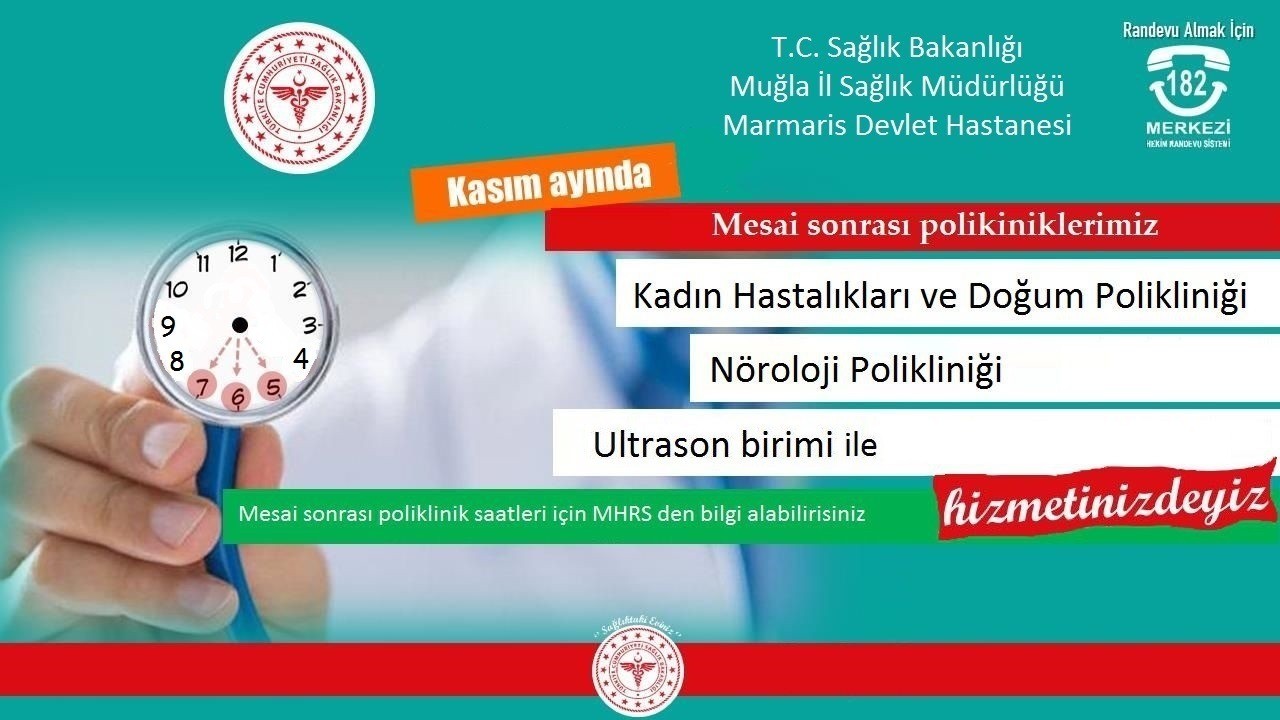 Marmaris Devlet Hastanesinde saat 17.00’da biten muayene saatleri bazı poliklinikler için 19.00’a kadar uzatıldı. Kadın Hastalıkları ve Doğum Polikliniği Op. Dr. Akın Acıbozlar, Nöroloji Kliniği Uzm. Dr. Elif Kahya ve Ultrason Birimi Uzm. Dr. Metin Bora Vardar saat 19.00’a kadar hastanede Kasım ayı sonuna kadar hasta kabulü yapacaklar.