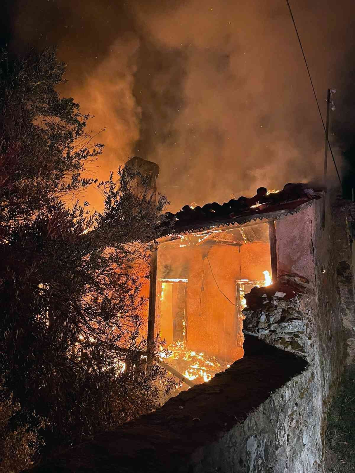 Muğla’nın Menteşe ilçesi kırsal Denizova Mahallesinde gece saatlerinde çıkan ev yangınında iki katlı ahşap katlı bina tamamen yandı.