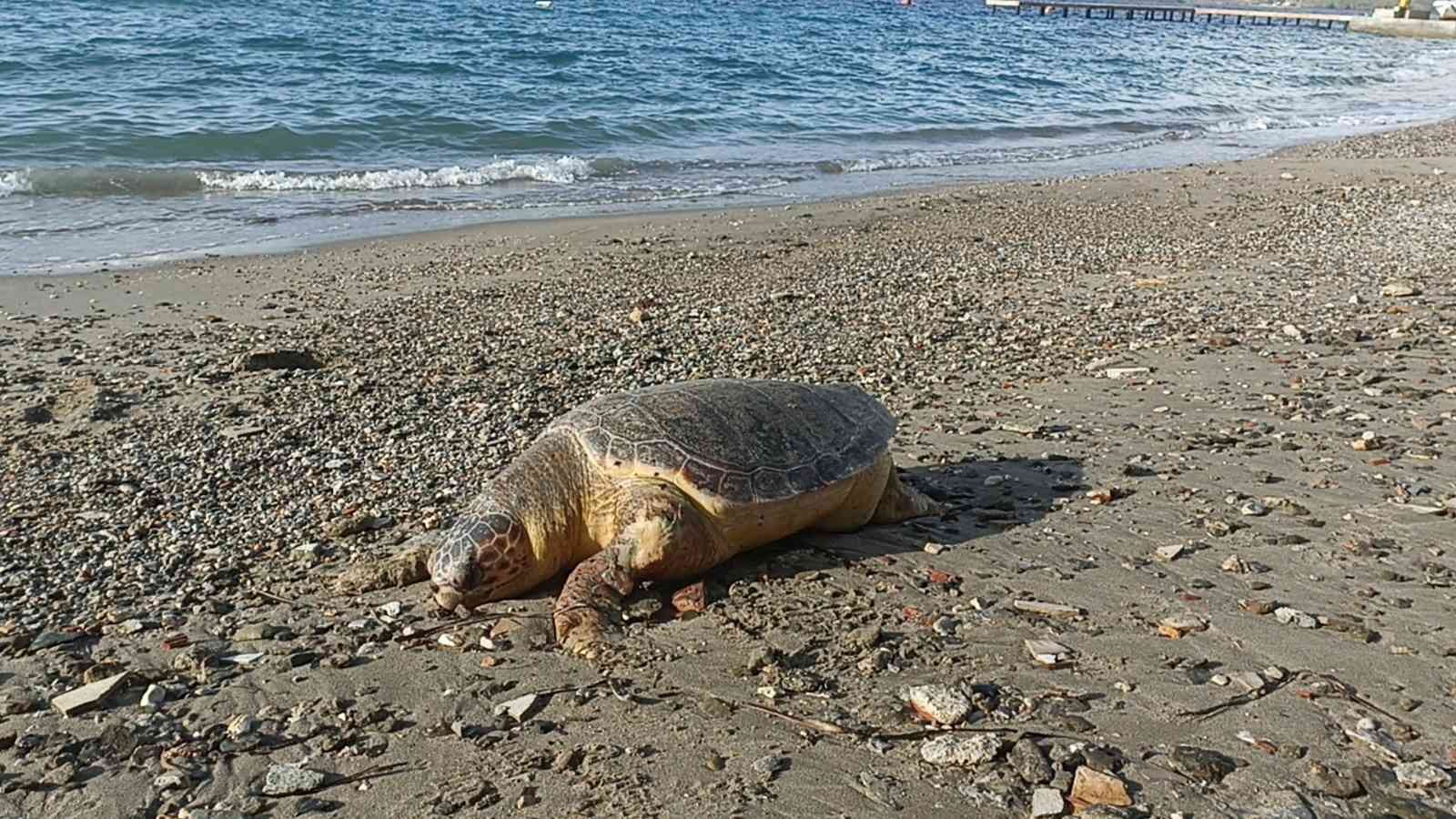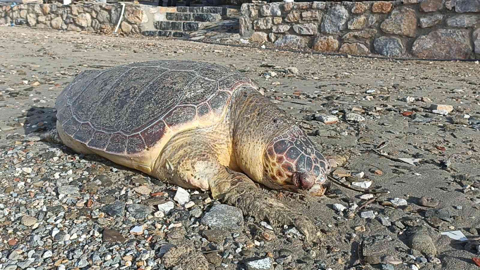 BODRUM’DA NESLİ TÜKENMEKTE OLAN CARETTA CARETTA CİNSİ KAPLUMBAĞA, FIRTINANIN ETKİSİYLE ÖLÜ HALDE SAHİLE VURDU