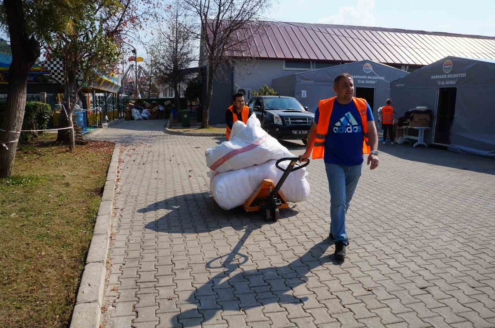 Marmaris Belediyesi tarafından deprem bölgesi için vatandaşların destekleriyle toplanan yardım malzemeleri hem deprem bölgesine hem de ilçeye yerleşen depremzedelere ulaştırmayı sürdürüyor.