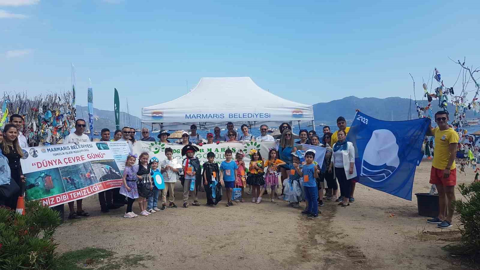 MARMARİS’TE DÜNYA ÇEVRE GÜNÜNDE PLAJLAR TEMİZLENDİ MAVİ BAYRAK ASILDI