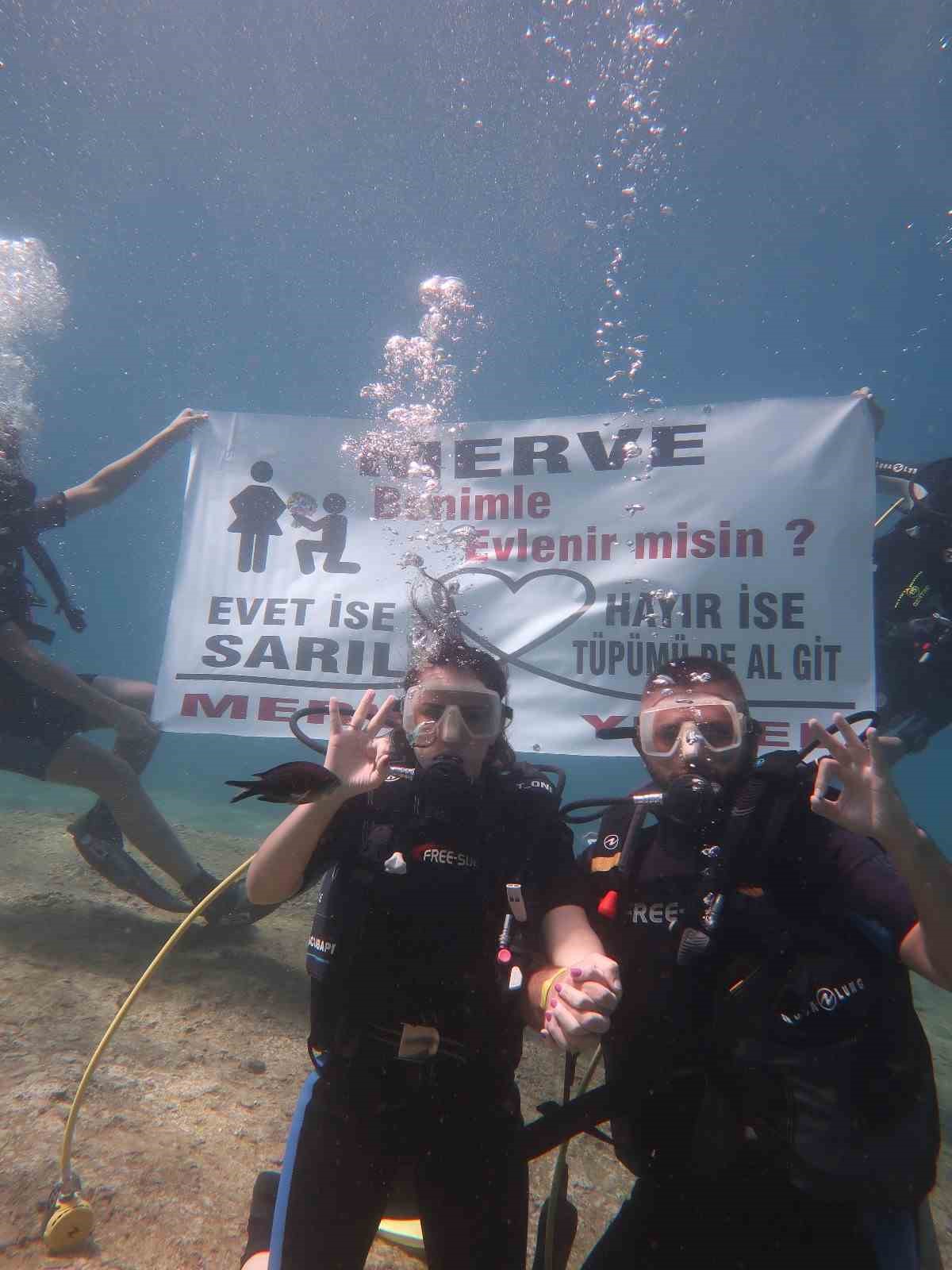 İstanbul’dan Fethiye’ye tatile gelen Yücel Çam, denizin dibinde açtığı dev afişle kız arkadaşı Merve Kahrıman’a sürpriz bir evlilik teklifi yaptı.