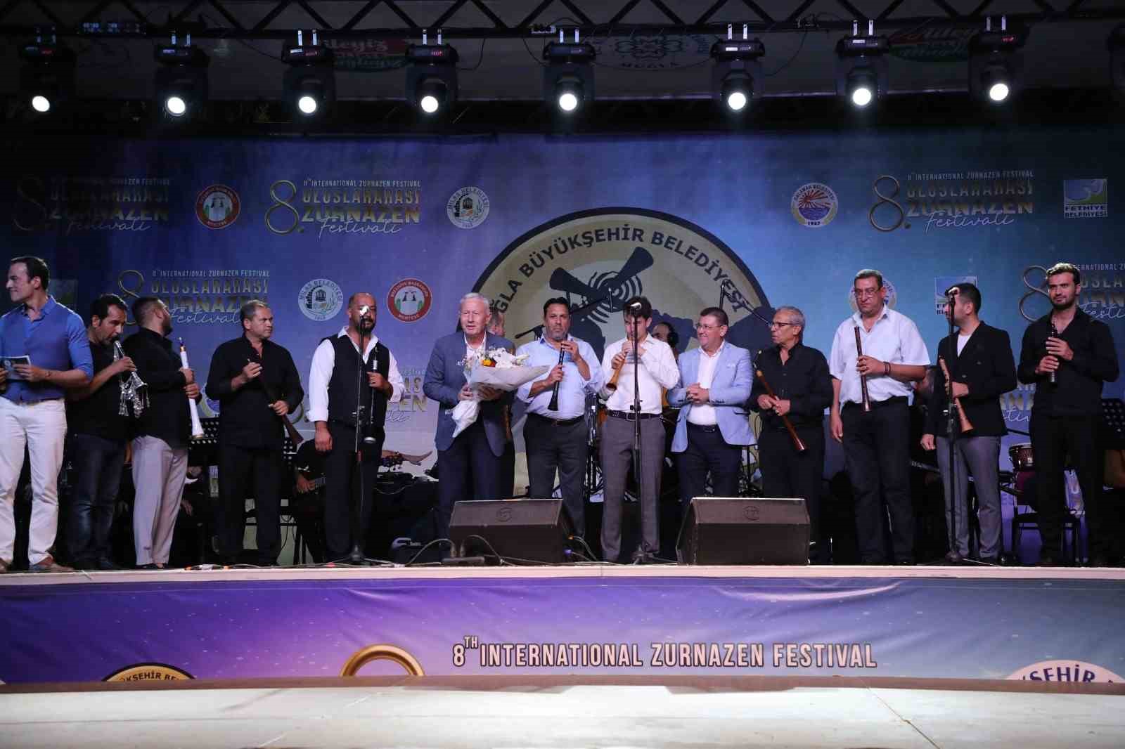 Milas’taki Zurnazen Festivali sanatçılarına çiçek verilmesinden sonra tüm sanatçıların İzmir Marşı’nı sahnede çalması ile sona erdi.
