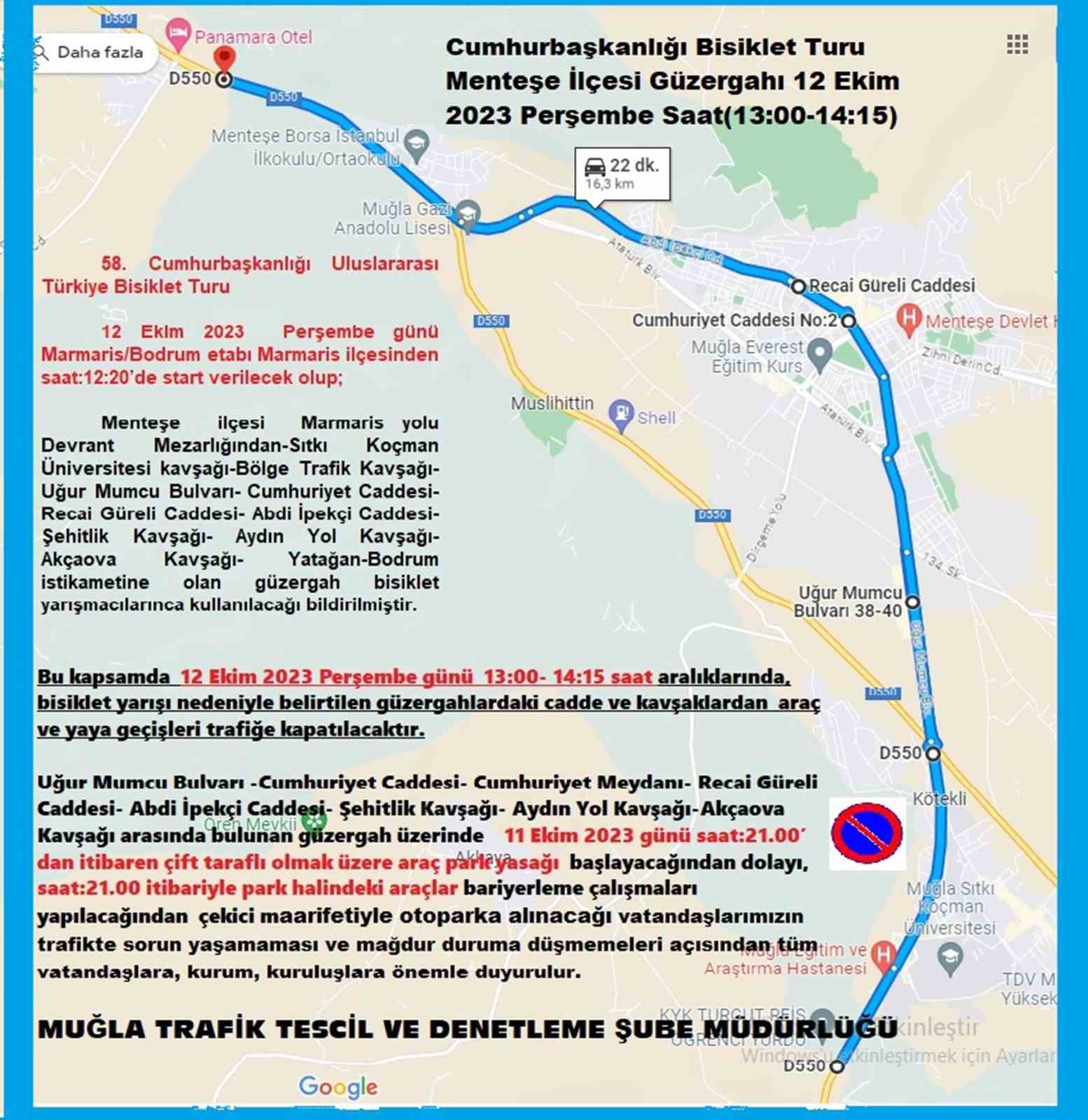 58. Cumhurbaşkanlığı Uluslararası Türkiye Bisiklet Turu, 12 Ekim 2023 Perşembe günü Marmaris/Bodrum etabı Marmaris ilçesinden saat:12:20’de startverilecek. Menteşe ilçesi Marmaris yolu Devrant Mezarlığından Sıtkı Koçman Üniversitesi kavşağı-Bölge Trafik Kavşağı-Uğur Mumcu Bulvarı-Uçaklı Kavşak-Aylin Karaca Kavşağı-Cumhuriyet Caddesi-Cumhuriyet Meydanı-Recai Güreli Caddesi-Abdi İpekçi Caddesi-Şehitlik Kavşağı-Aydın Yol Kavşağı-Akçaova Kavşağı-Yatağan-Milas-Bodrum istikametine olan güzergah bisiklet yarışmacılarınca kullanılacak.