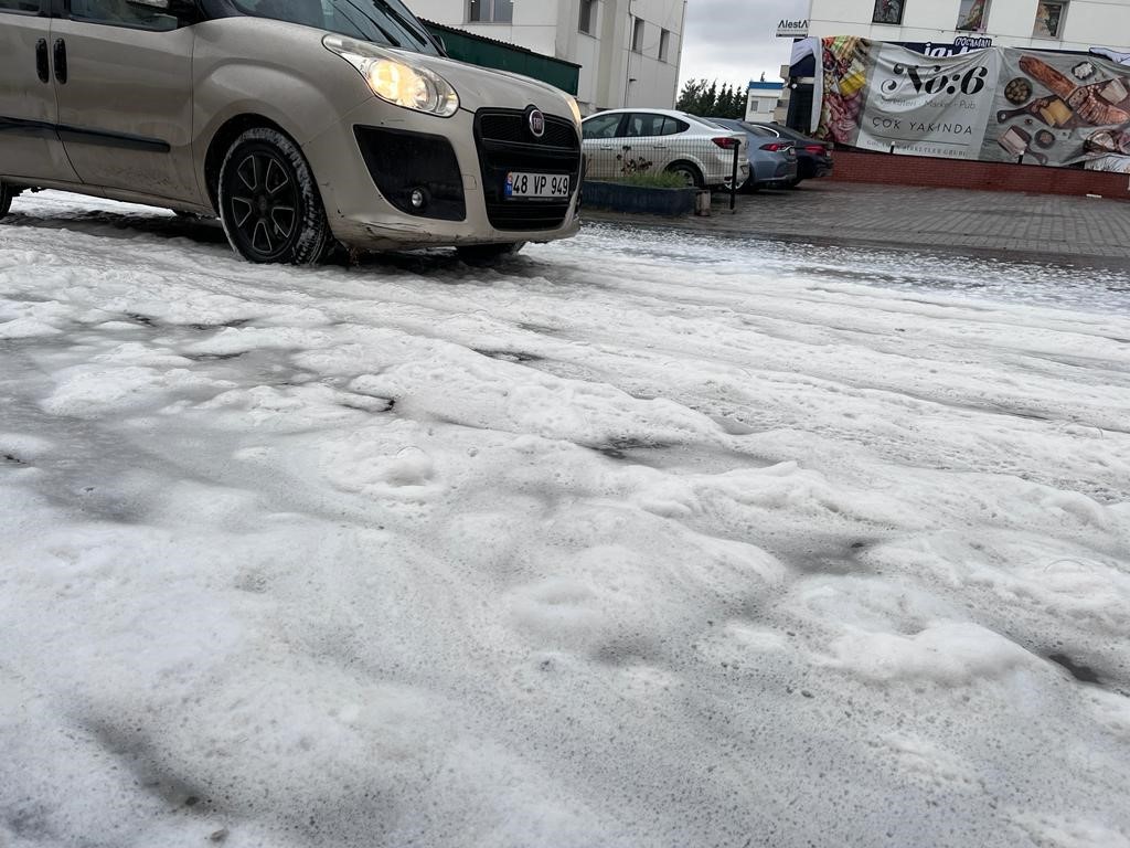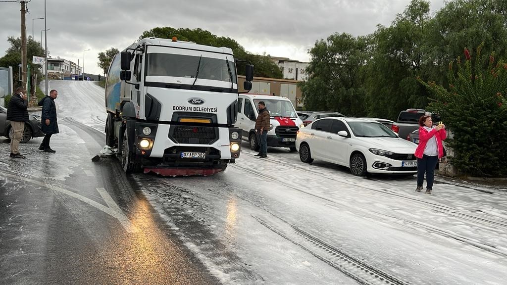 Muğla’nın Bodrum ilçesinde yağmur sonrası yolda yoğun bir köpük tabakası oluştu. Bir araçtan yola dökülen deterjandan kaynaklandığı tahmin edilen köpük, belediye ekiplerince temizlendi.
