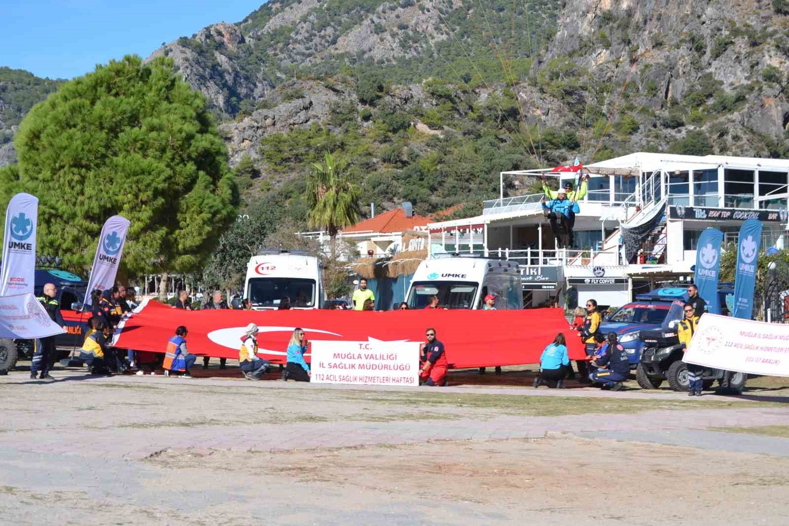Muğla’nın Fethiye ilçesinde görev yapan acil sağlık merkezi çalışanları “Acil Sağlık Hizmetleri Haftası’nı” yamaç paraşütünde Türk bayrağı açarak kutladı.