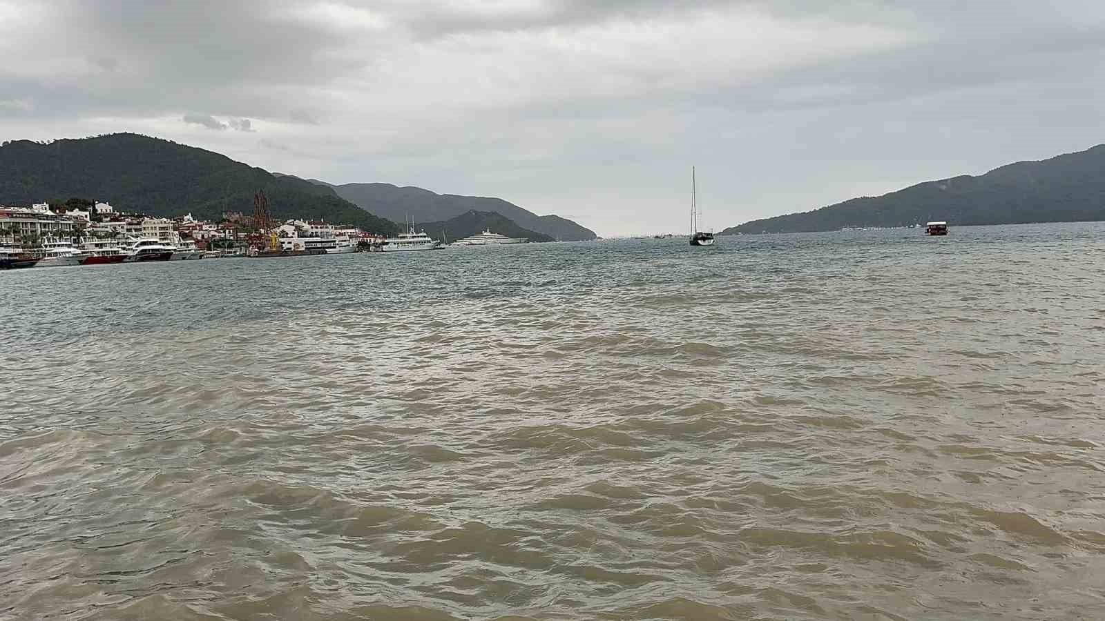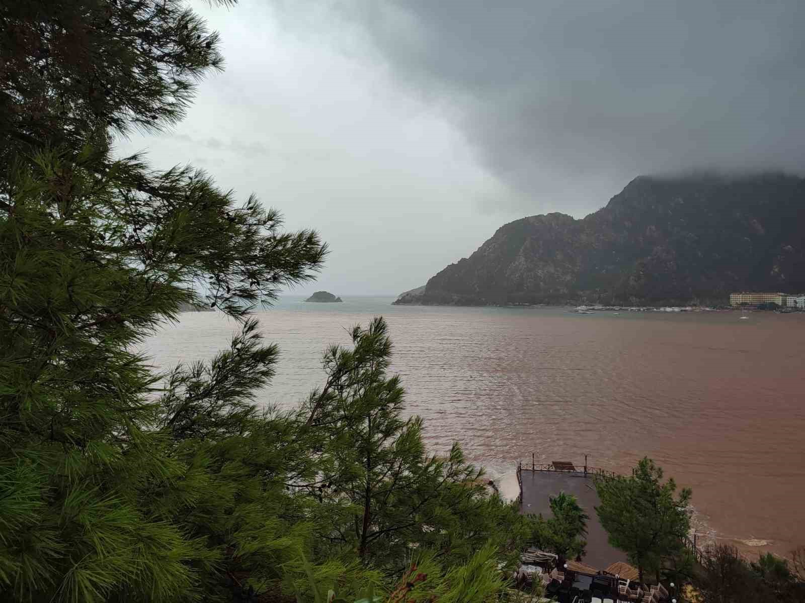 Yağışlarla beraber dağlardan akan balçıklı sularla dolan dereler aktıkları denizin rengini kahverengiye çevirdi. Hava sıcaklığının 17 derece olduğu Marmaris’te etkisini gösteren yağışların akşam saatlerine kadar devam edeceği tahmin ediliyor.