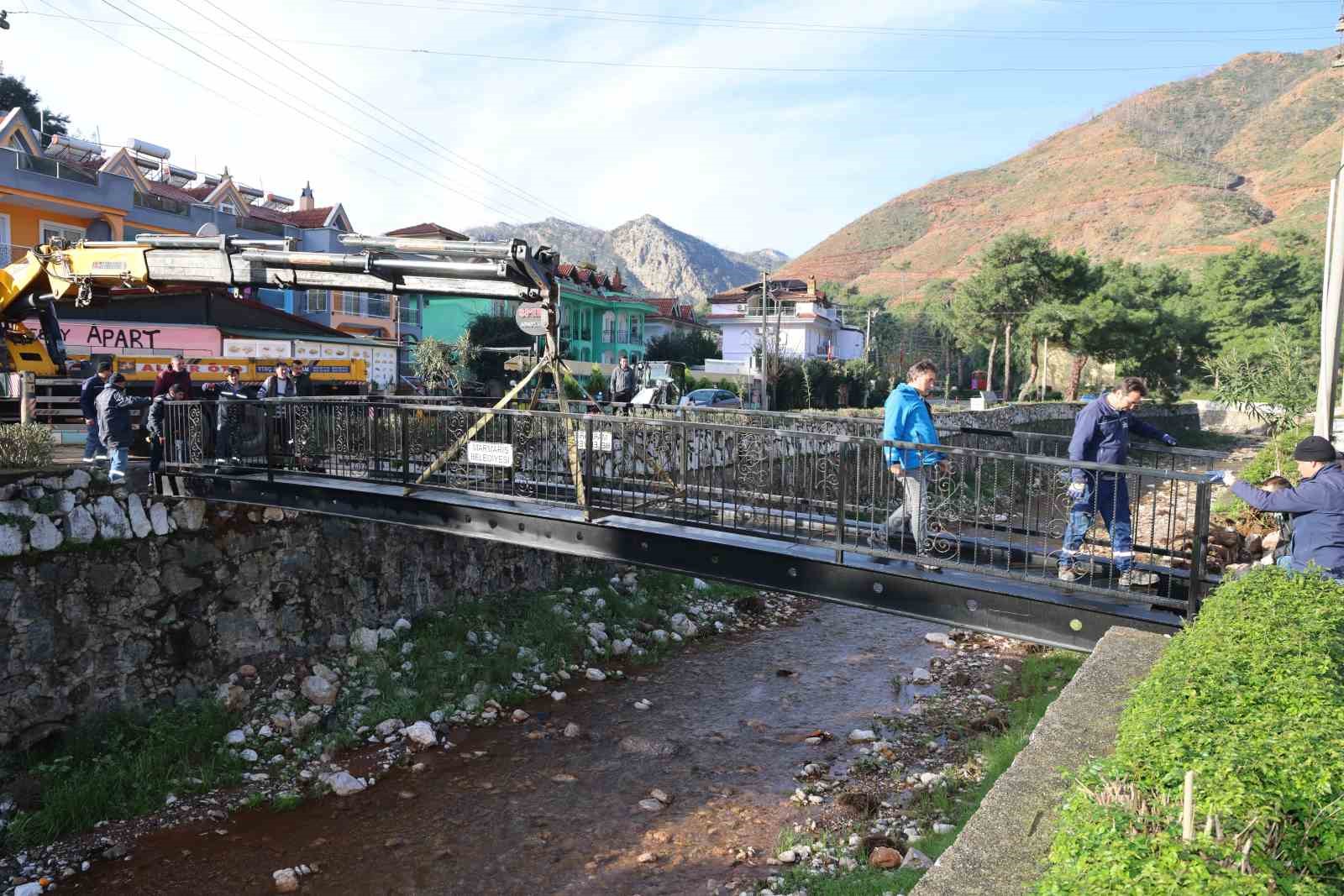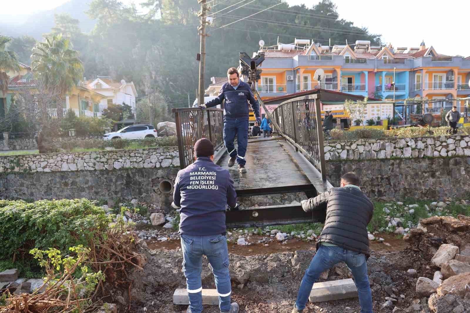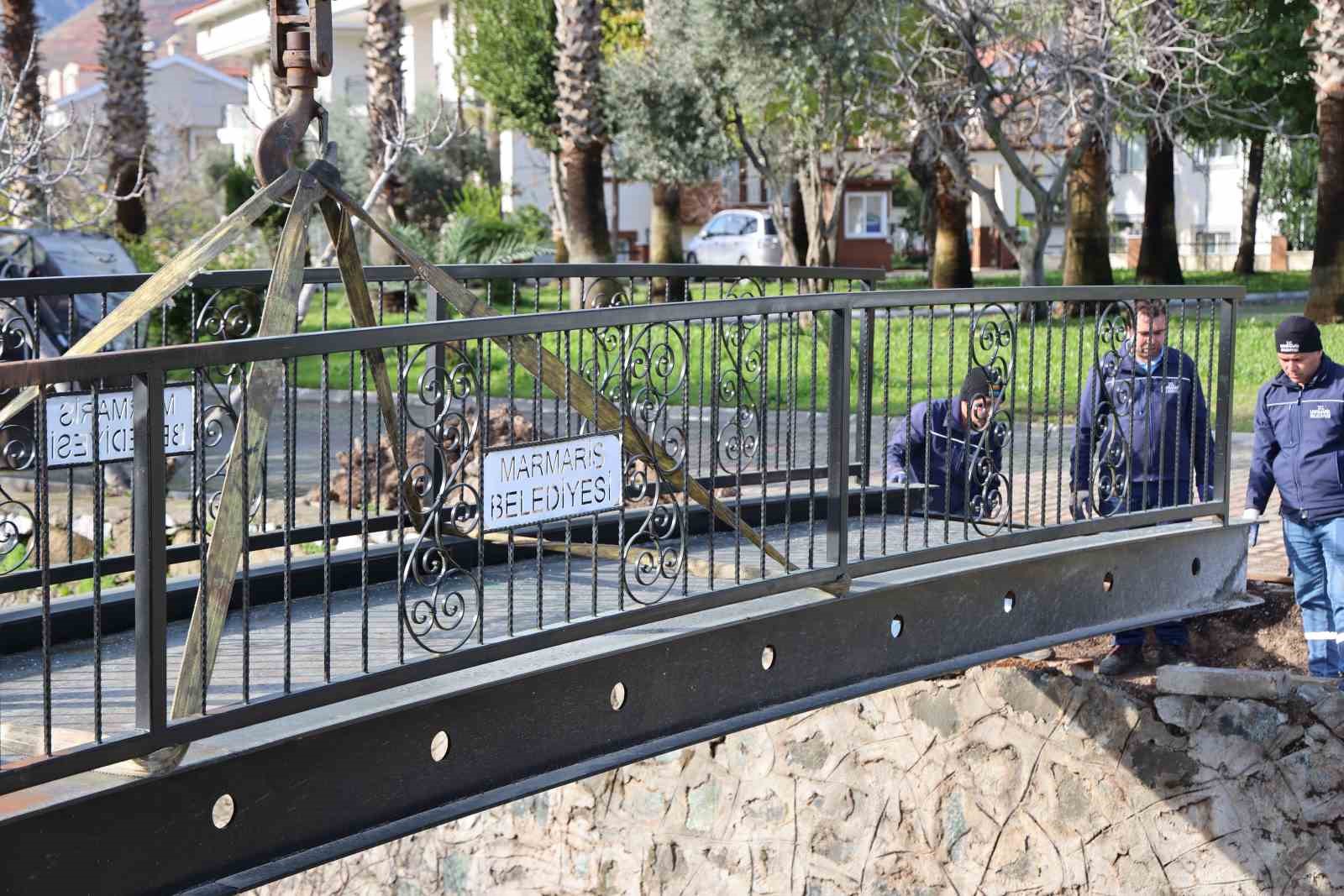 Marmaris Belediyesi Makine Araç Parkı ekipleri tarafından köprü yenileme ve bakım çalışmaları devam ediyor. Bu doğrultuda İçmeler Mahallesi’nde 137. sokakta bulunan dere üzerindeki eski köprü Makine Araç Parkı ekiplerince yenilendi. Çalışmalar kapsamında eskimiş ve kullanımı tehlike oluşturan ahşap köprü yerinden sökülerek yerine, tamamı Makine Araç Parkı ekipleri tarafından üretilen, çağdaş ve modern çizgiler taşıyan, 2 köprü konuldu. Biri 10 metre diğeri, 13.5 metre uzunluğunda, 1 buçuk metre genişliğindeki iki köprü sabah saatlerinde yapılan çalışmayla vinç yardımıyla yeni yerlerine yerleştirildi. Demir ve ahşap aksamlı, bölge ile uyum sağlayan köprü vatandaşlardan da beğeni topladı. Makine araç parkı ekiplerinin bakım-onarım ve yenileme çalışmaları ilerleyen günlerde de devam edecek.