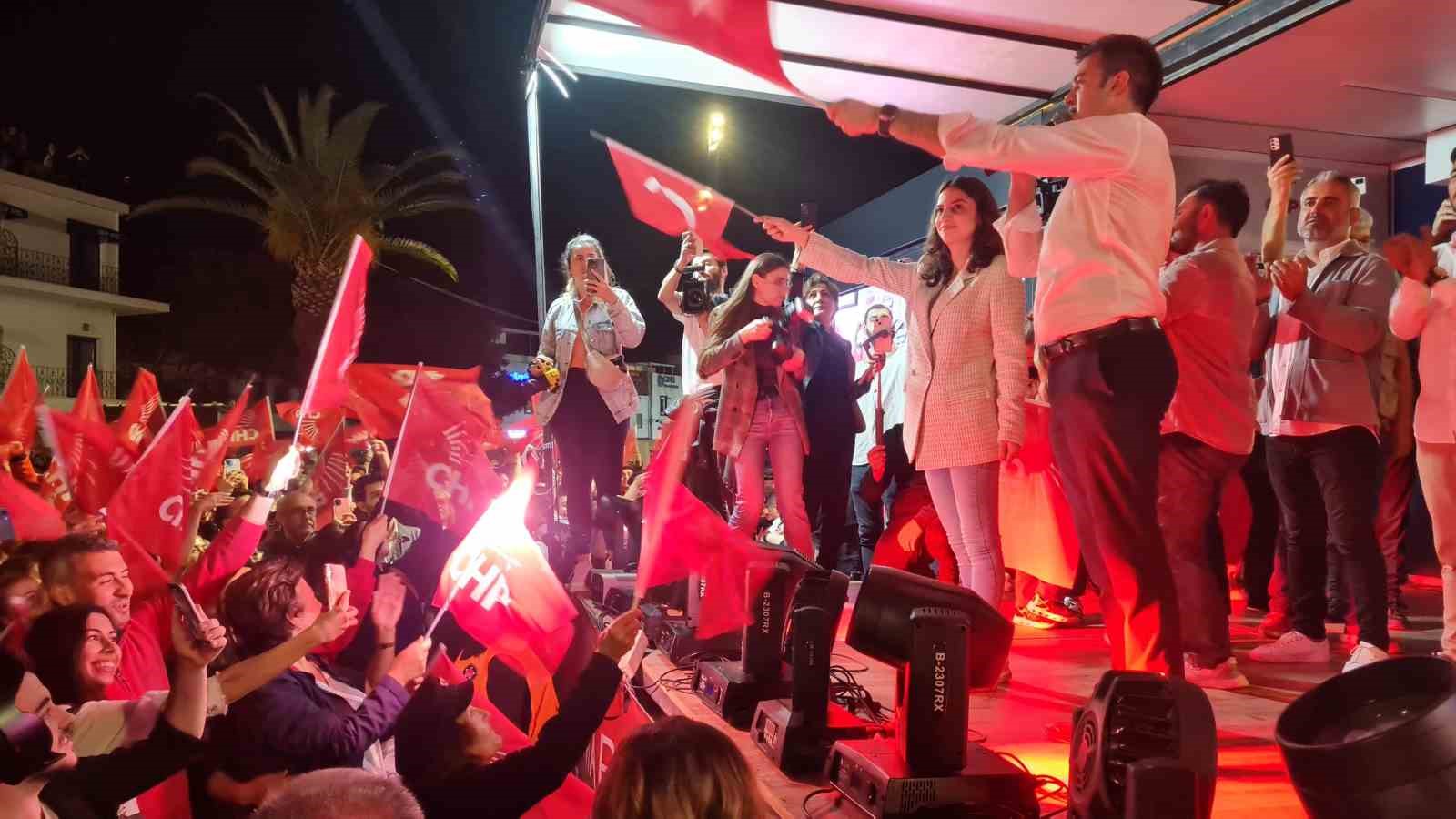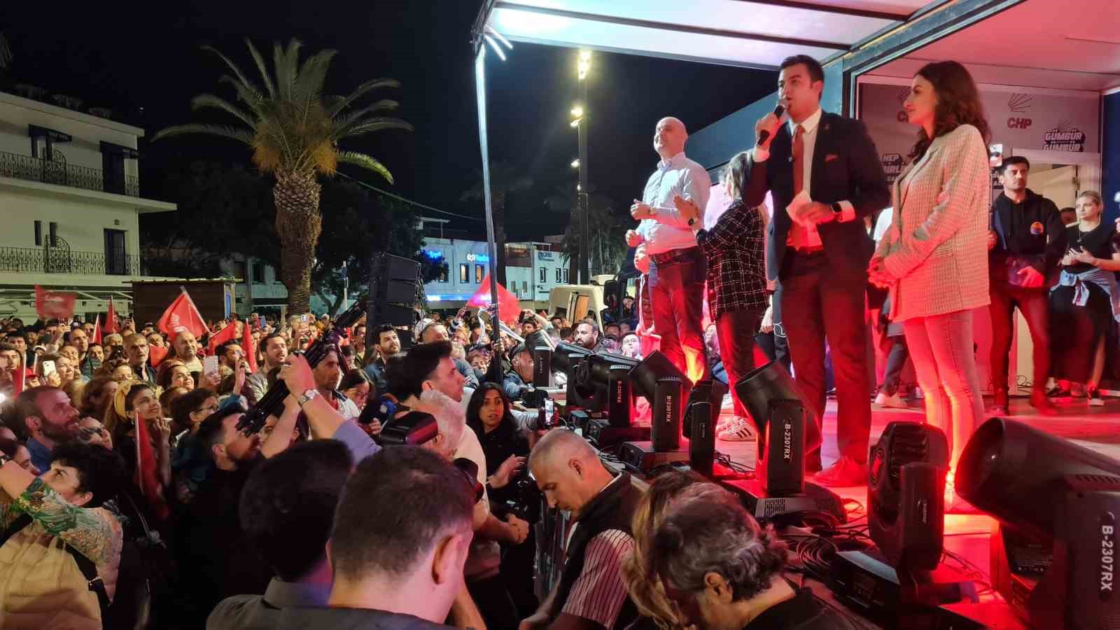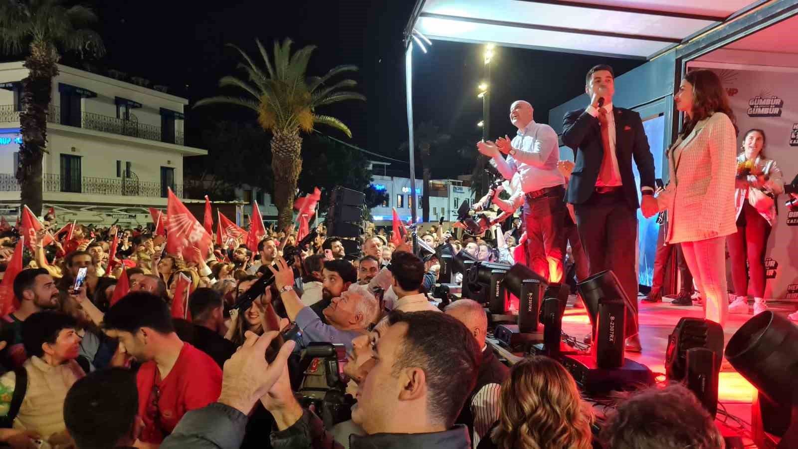 Tamer Mandalinci’yi Bodrum Belediye Meydanı’nda Türk Bayrakları ve CHP Bayrakları ile marşlar söyleyen binlerce Bodrumlu karşıladı. Eşi Sezin Mandalinci ile sahneye çıkan Tamer Mandalinci, elinde Türk Bayrağı ile marşlar söyledi. Sahnede Kerimoğlu ve Harmandalı oynayan Genç Başkan’a geçmiş dönem belediye başkanlarından Mehmet Kocadon da eşlik etti.
