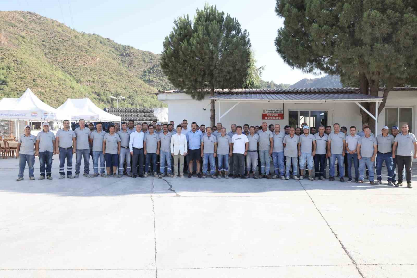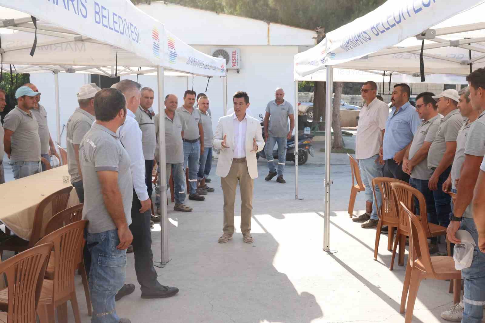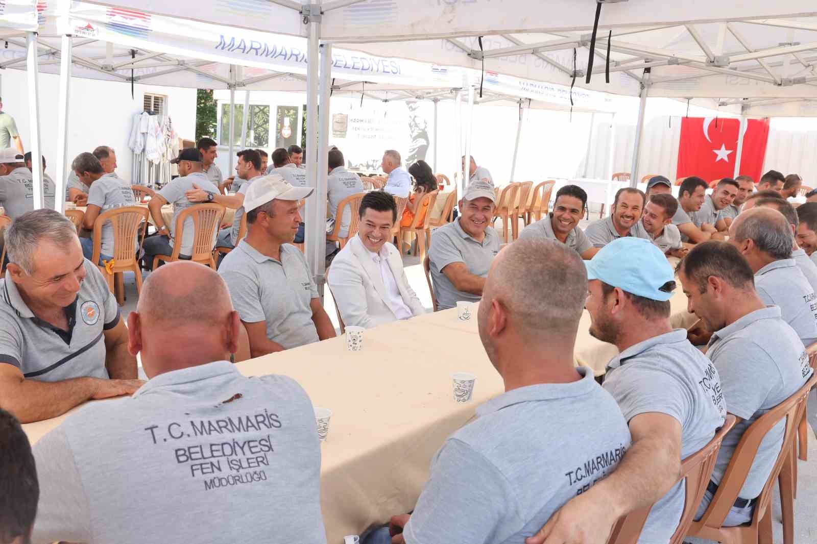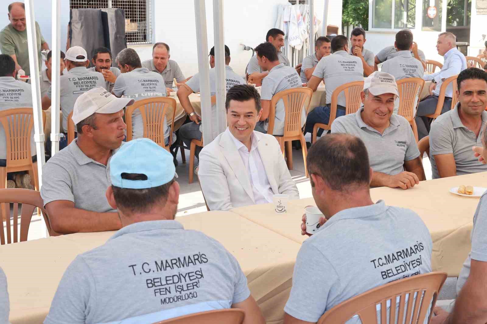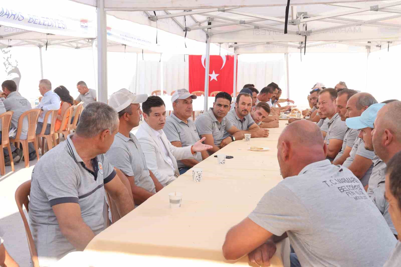 AYDIN (İHA) – MARMARİS BELEDİYE BAŞKANI ACAR ÜNLÜ, FEN İŞLERİ MÜDÜRLÜĞÜ İŞÇİLERİ İLE MAKİNE ARAÇ PARKI’NDA DÜZENLENEN KAHVALTIDA BİR ARAYA GELDİ.