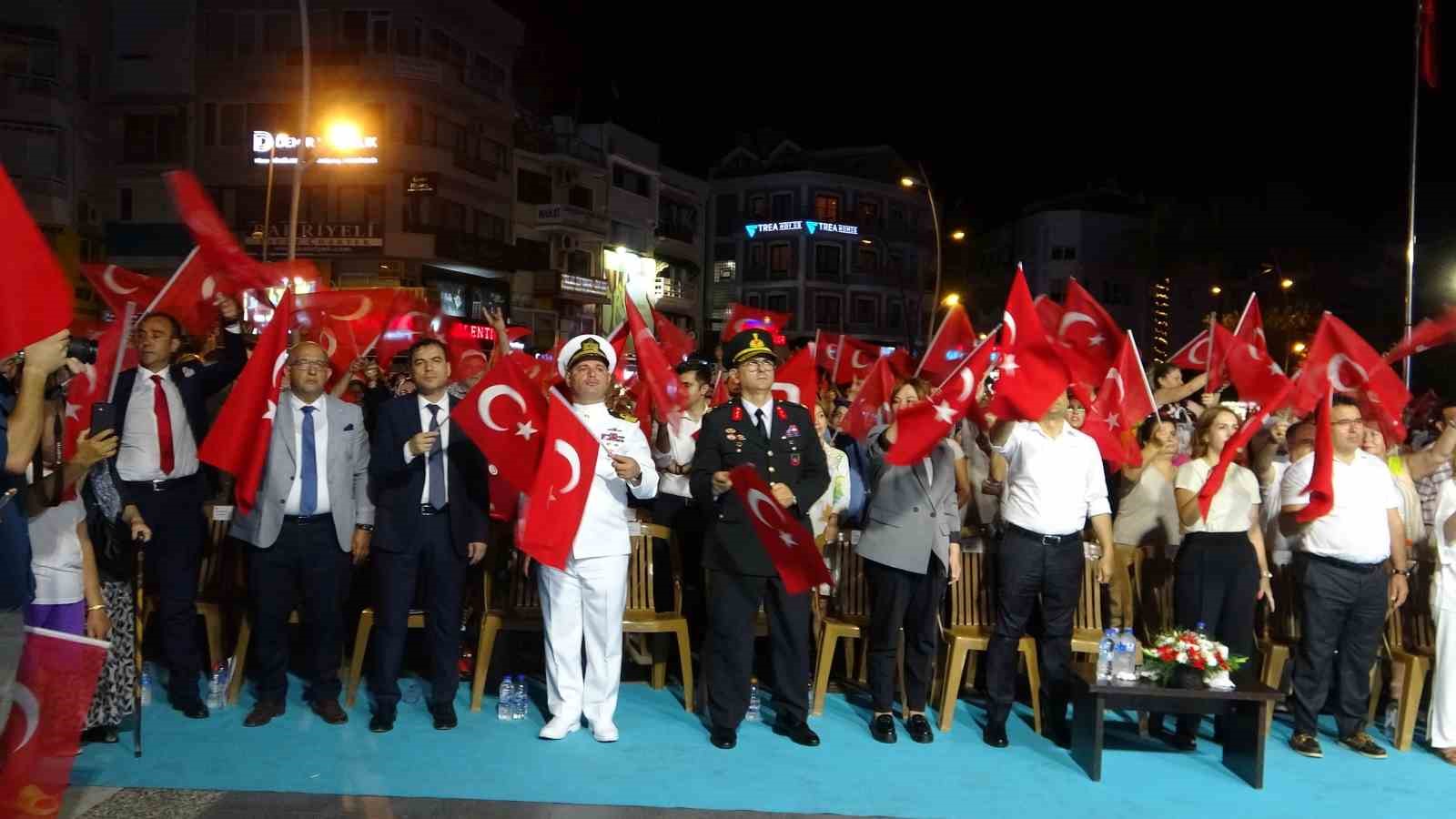 Atatürk Meydanını dolduran kalabalık, ellerindeki Türk bayraklarıyla çalınan marşlara eşlik etti. Aksaz Deniz Üs Komutanlığı Bandosu eşliğinde saygı duruşu ve İstiklal Marşı’nın ardından şehitler için Kur’an-ı Kerim okundu. Cumhurbaşkanı Recep Tayyip Erdoğan’ın mesajının ardından, AK Parti ve MHP il başkanları, AK Parti Muğla milletvekillerinin konuşmalarının ardından Muğla Valisi İdris Akbıyık günün anlam ve önemine binaen bir konuşma yaptı. Törenler sırasında Sahil Güvenlik Komutanlığı’na bağlı TSCG 310 botu denizde gösteri yaparken, ilçedeki su sporları ekipleri de deniz üzerinde şov gerçekleştirdi.