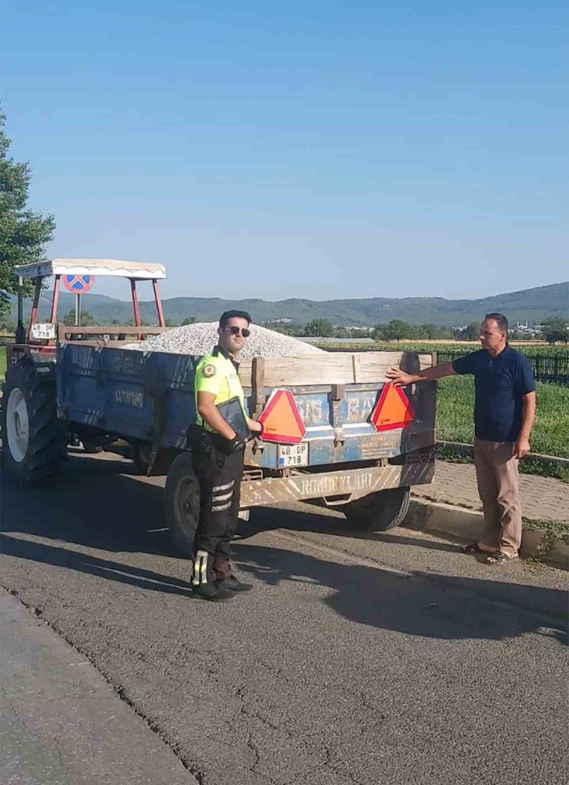 Tarımsal faaliyetlerin yoğun olarak yaşandığı bölgelerdeki yollarda seyreden traktörler için Muğla Emniyet Müdürlüğü Trafik Tescil ve Denetleme Şube Müdürlüğü ekipleri hem denetim yapıyor, hem de reflektörü olmayan traktörlerin römorklarına reflektör hediye ediyor.