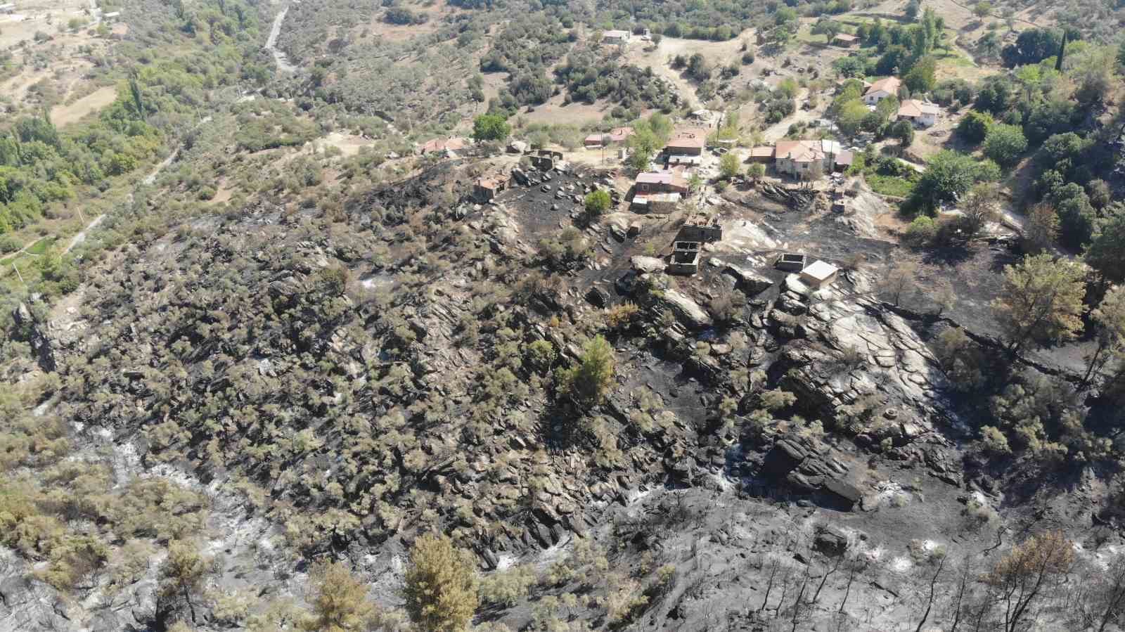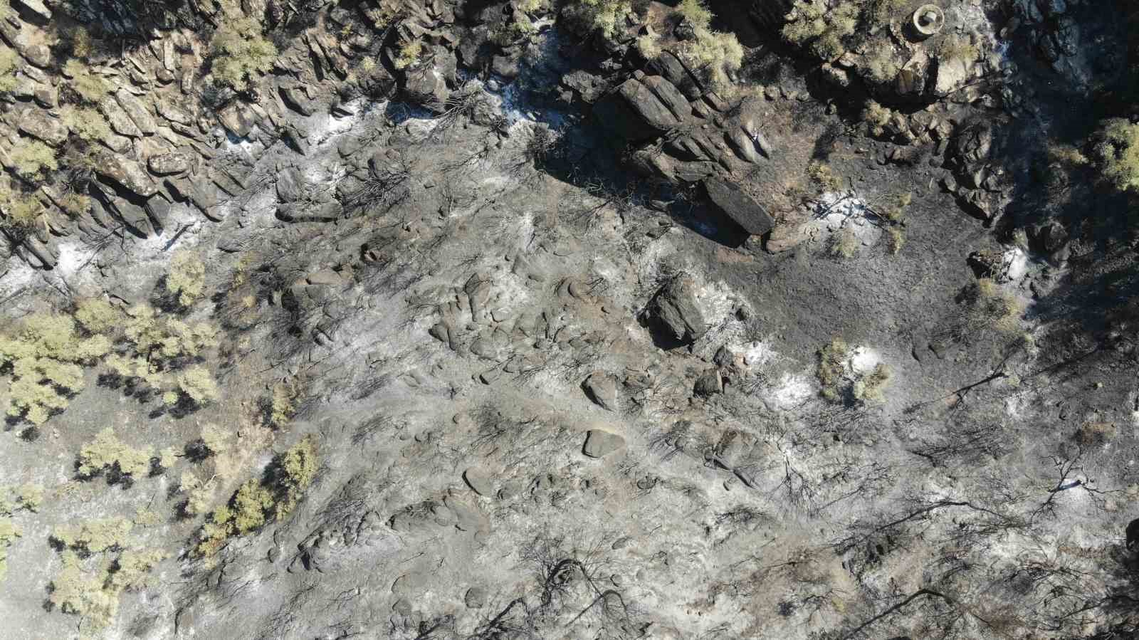 Yangının ardından alevlere teslim olan bölge droneile böyle görüntülendi. Toprak örtüsü simsiyah olurken, ağaçlar ve bitki örtüsü yanarak kül oldu. Siyaha bürünen yerlerin görüntüsü görenleri kahretti.