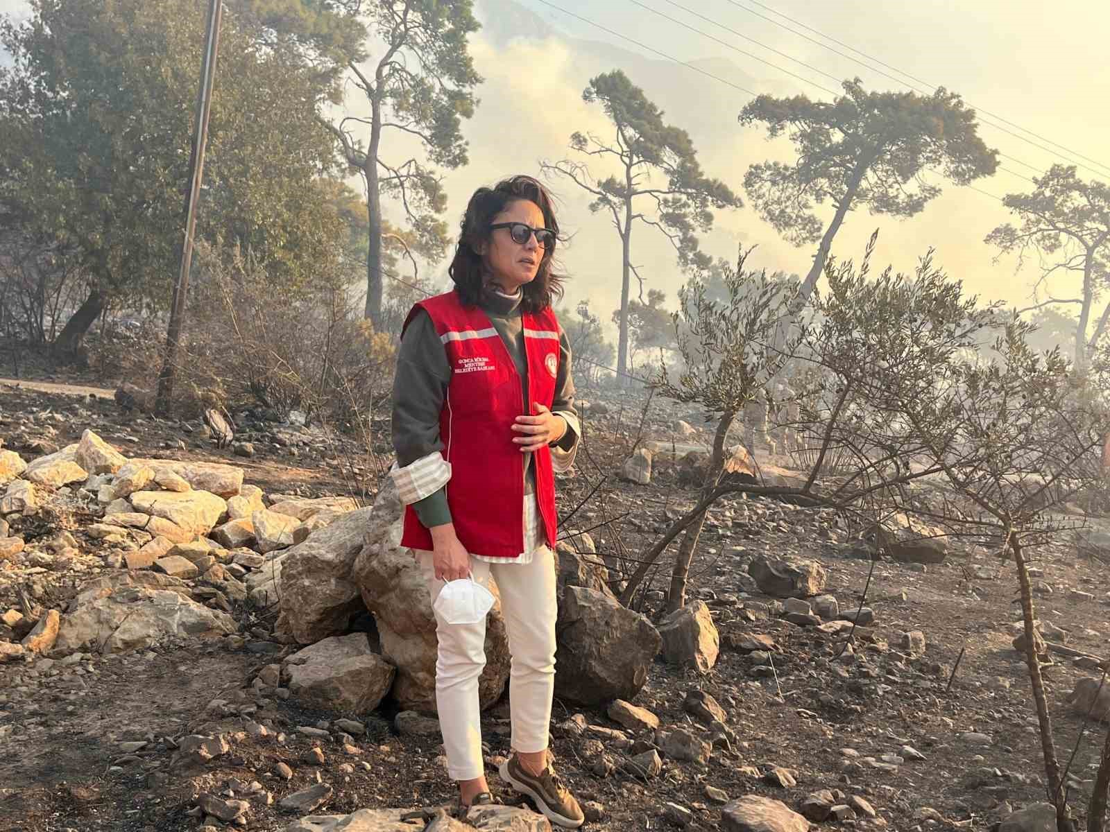 MUĞLA (İHA) – MUĞLA’NIN MENTEŞE İLÇESİNDE SABAHA KARŞI ÇIKAN ORMAN YANGININA MÜDAHALE DEVAM EDERKEN, YANGIN BÖLGESİNDE İNCELEMELERDE BULUNAN MENTEŞE BELEDİYE BAŞKANI GONCA KÖKSAL; “DOĞU VE BATI YÖNÜNDE KONTROL SAĞLANDI” DEDİ.