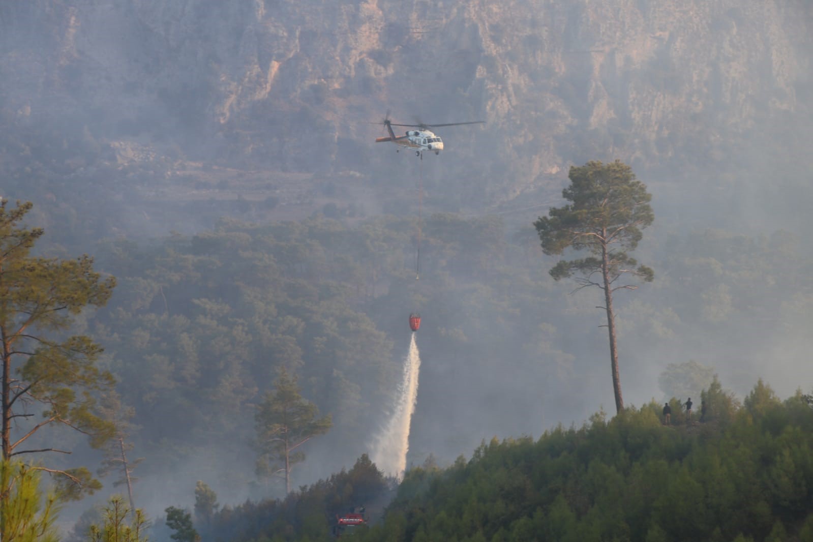 Dalaman’daki orman yangınında ekiplerin havadan ve karadan mücadelesi devam ediyor. Özellikle hava araçları adeta alevlerle savaşıyor. Yangın bölgesinde hava araçları ardı ardına yaptıkları sortilerle alevlerin üstüne su serpiyor. Uçak ve helikopterlerin havadan müdahalesi devam ederken, karadan da ekiplerin söndürme çalışmaları sürüyor. Şiddetli rüzgarla birlikte büyüyen alevleri kontrol altına almak için yoğun çaba sarf ediliyor.