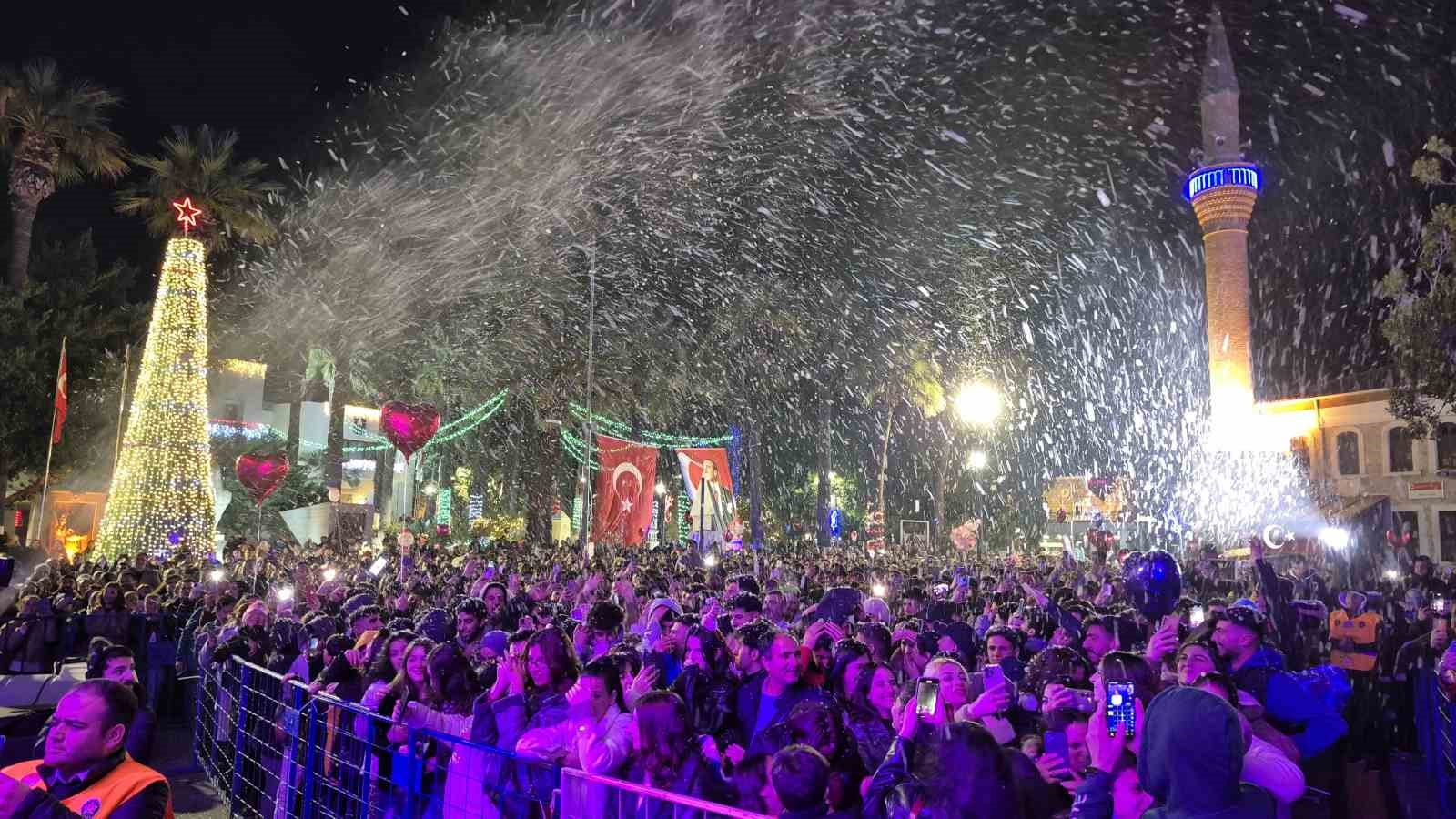 Muğla’nın Bodrum ilçesinde binlerce kişinin katılımıyla yeni yıl kutlaması yapıldı. Meydanda yapay kar yağdırıldı, havai fişek gösterileri yapıldı.