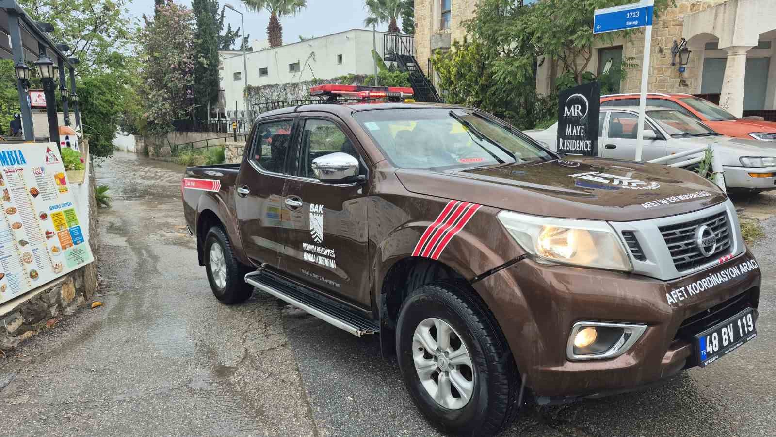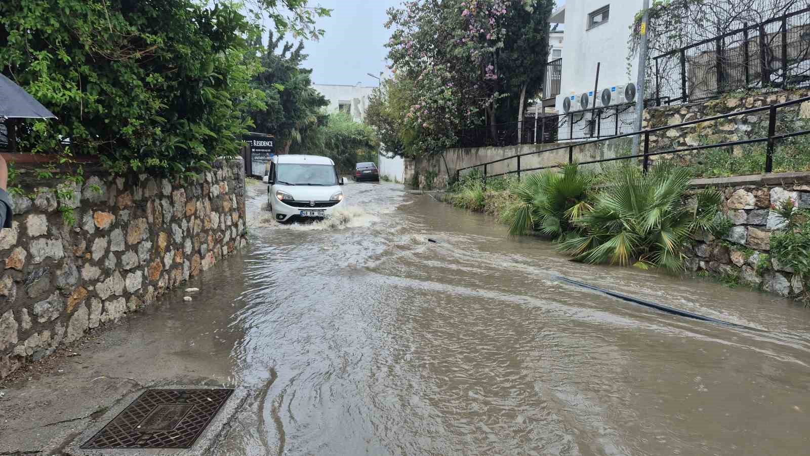 Muğla’nın Bodrum ilçesinde etkili olan sağanak yağış nedeniyle araçlar derede mahsur kaldı.
