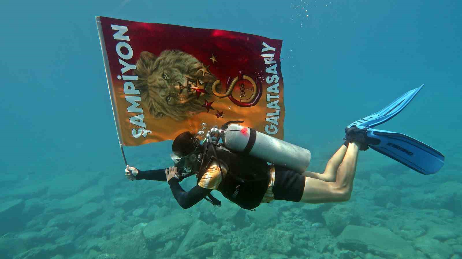 Fethiye’de bir grup dalgıç, su altında sarı-kırmızılı bayraklarla resmi geçit yaparak Galatasaray’ın şampiyonluğunu kutladılar.