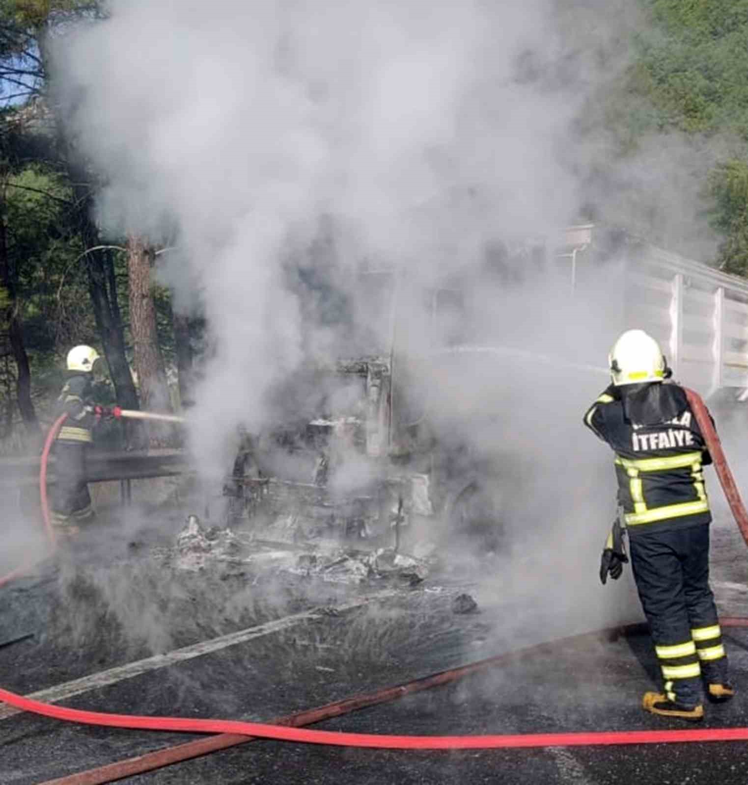 Gökova Sakartepe rampasında seyir halindeki bir kamyon çıkış nedeni tespit edilemeyen sebepten dolayı yanmaya başladı.